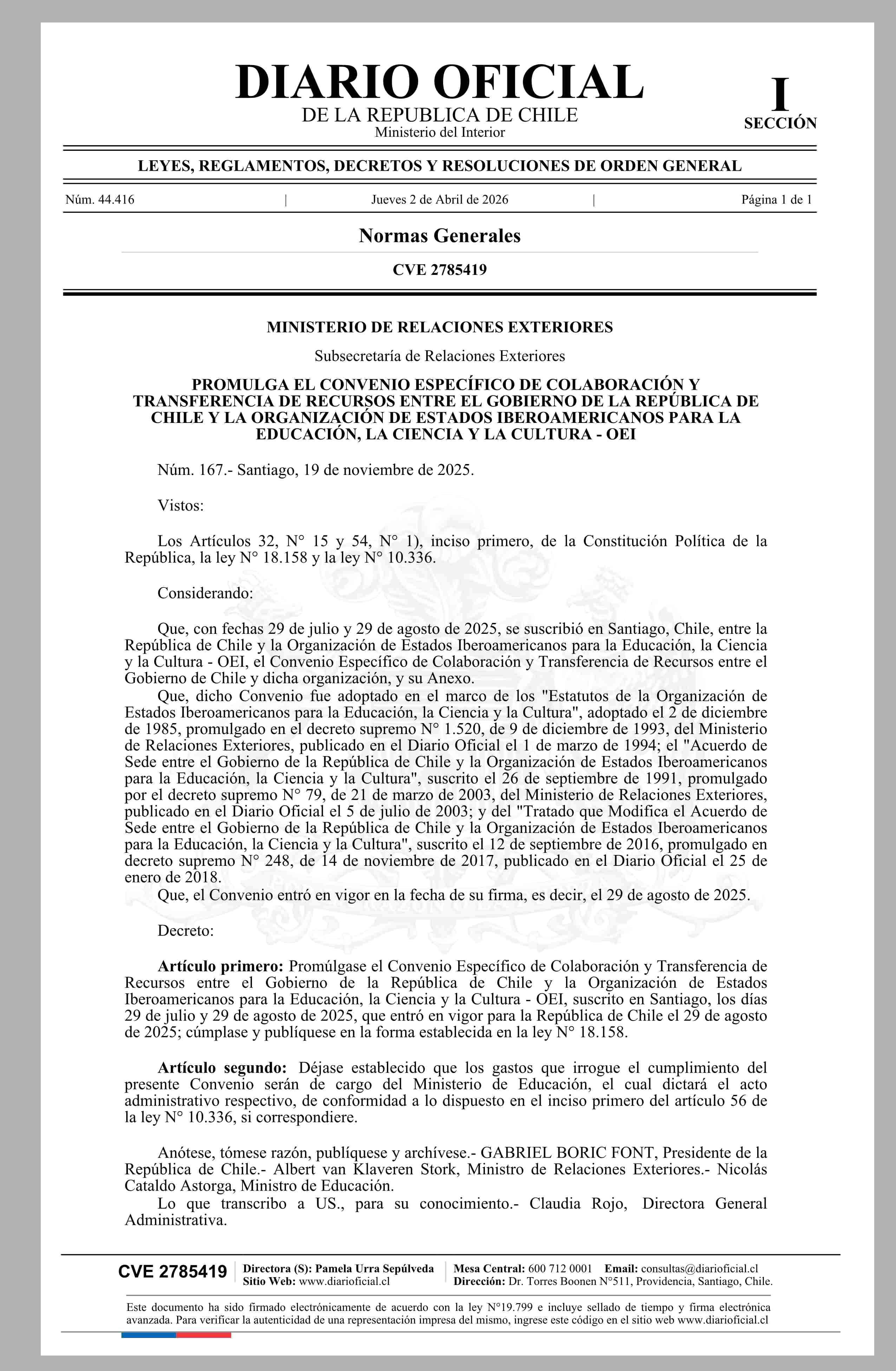 Título: PROMULGA EL CONVENIO ESPECÍFICO DE COLABORACIÓN Y TRANSFERENCIA DE RECURSOS ENTRE EL GOBIERNO DE LA REPUBLICA DE CHILE Y LA ORGANIZACIÓN DE ESTADOS IBEROAMERICANOS PARA LA EDUCACION, LA CIENCIA Y LA CULTURA - OEI