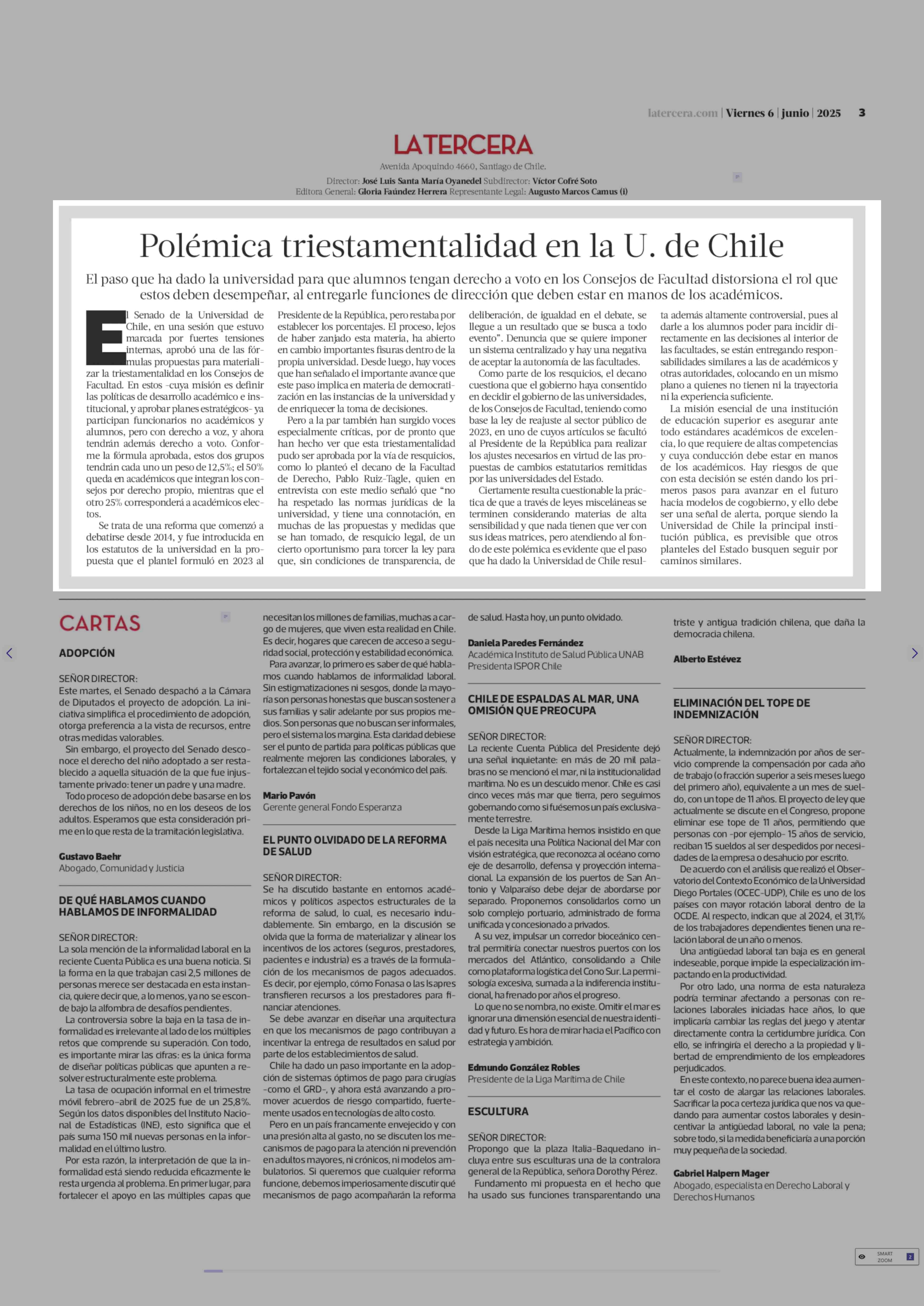 EDITORIAL: Polémica triestamentalidad en la U. de Chile 06-06-2025 La Tercera |