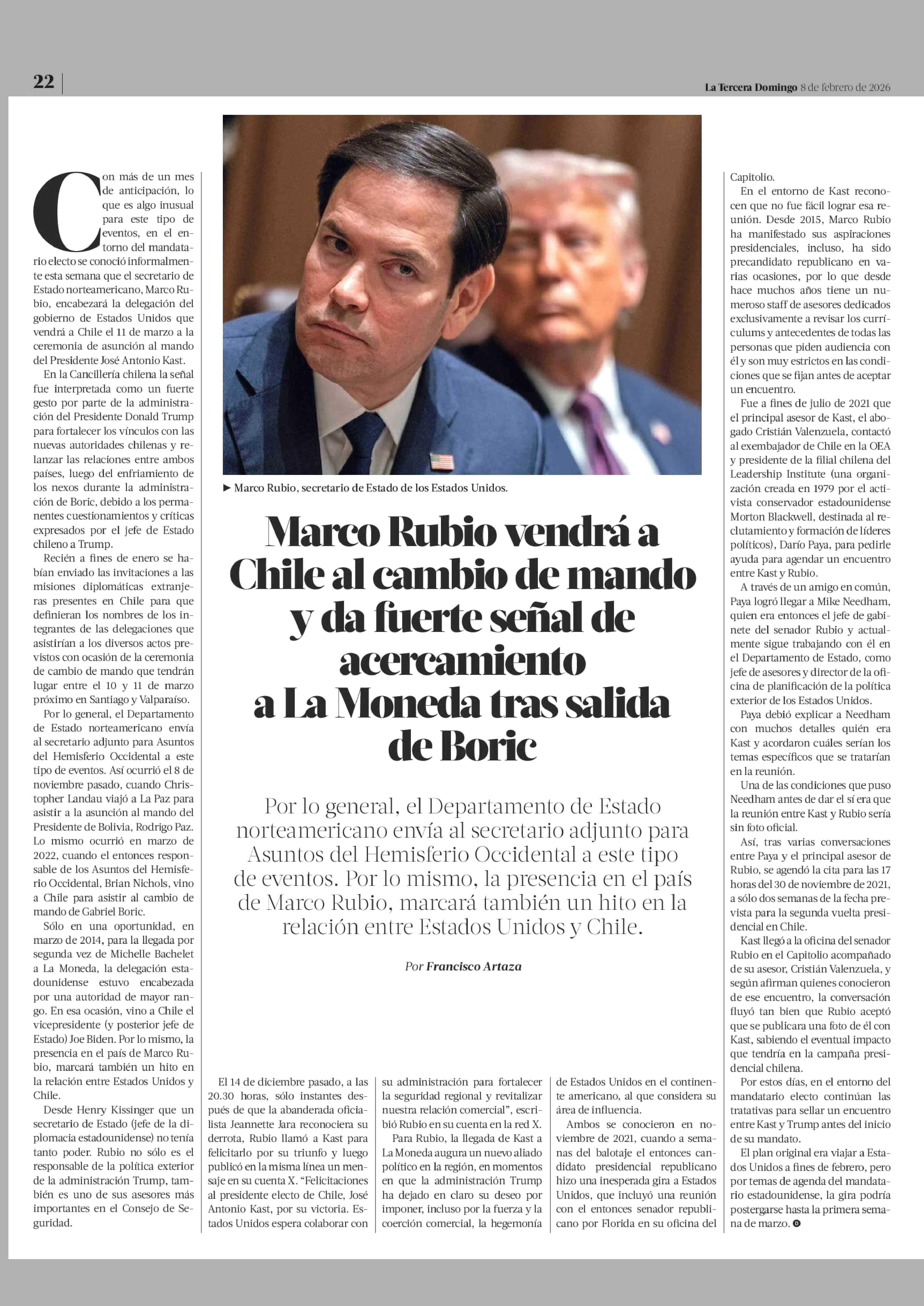 Título: Marco Rubio vendrá a Chile al cambio de mando y da fuerte señal de acercamiento a La Moneda tras salida de Boric