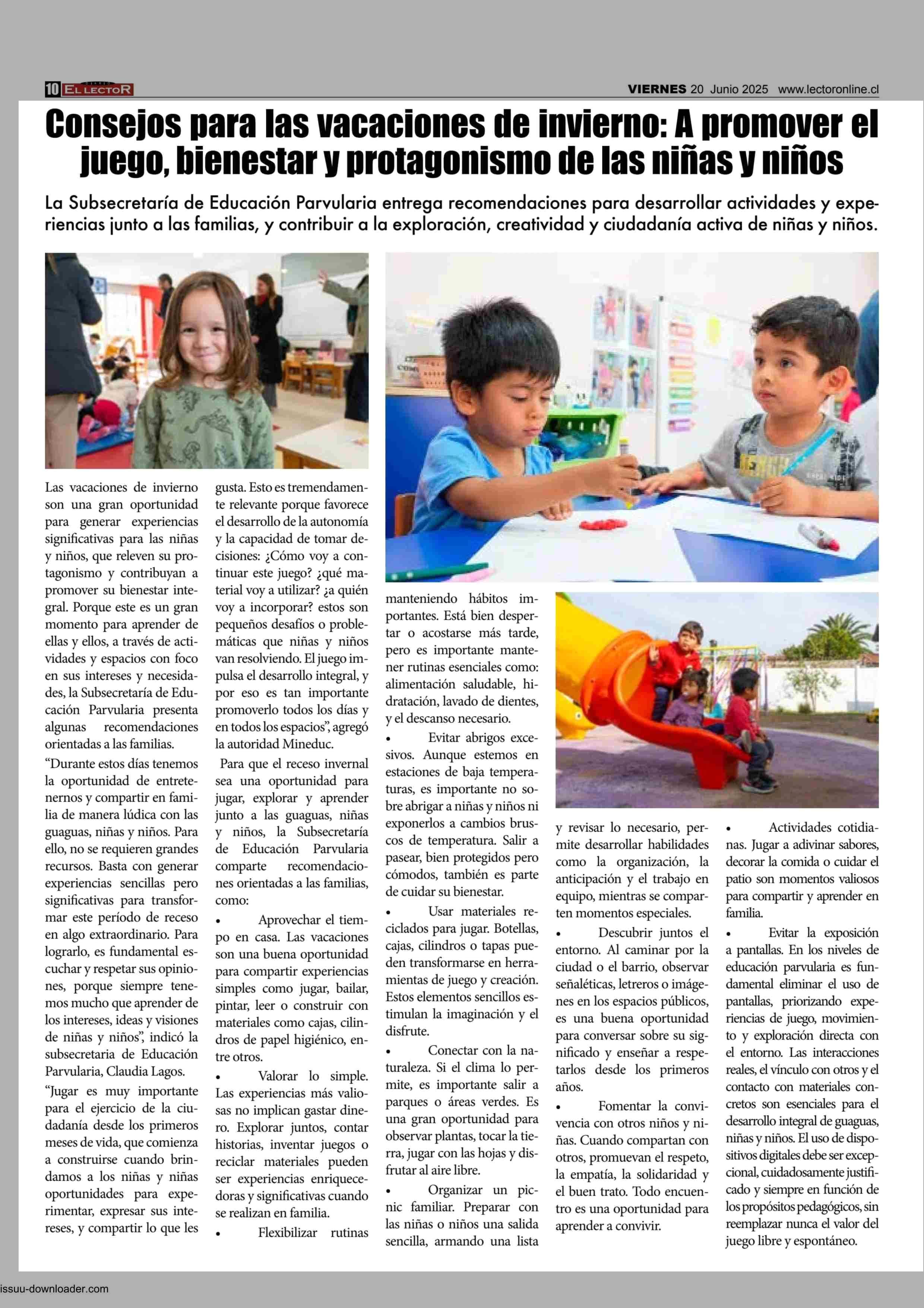Consejos para las vacaciones de invierno: A promover el juego, bienestar y protagonismo de las niñas y niños 20-06-2025 El Lector |