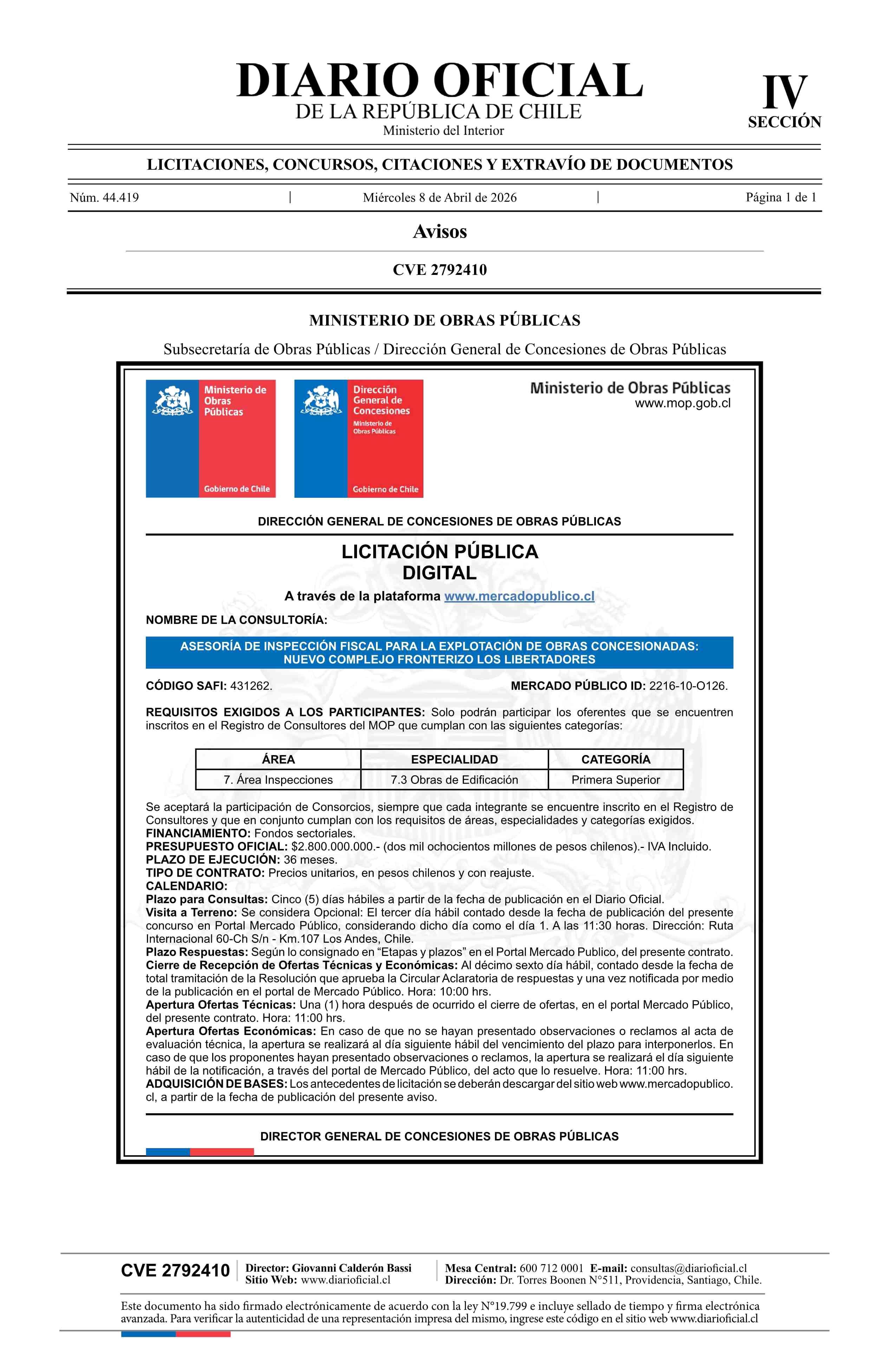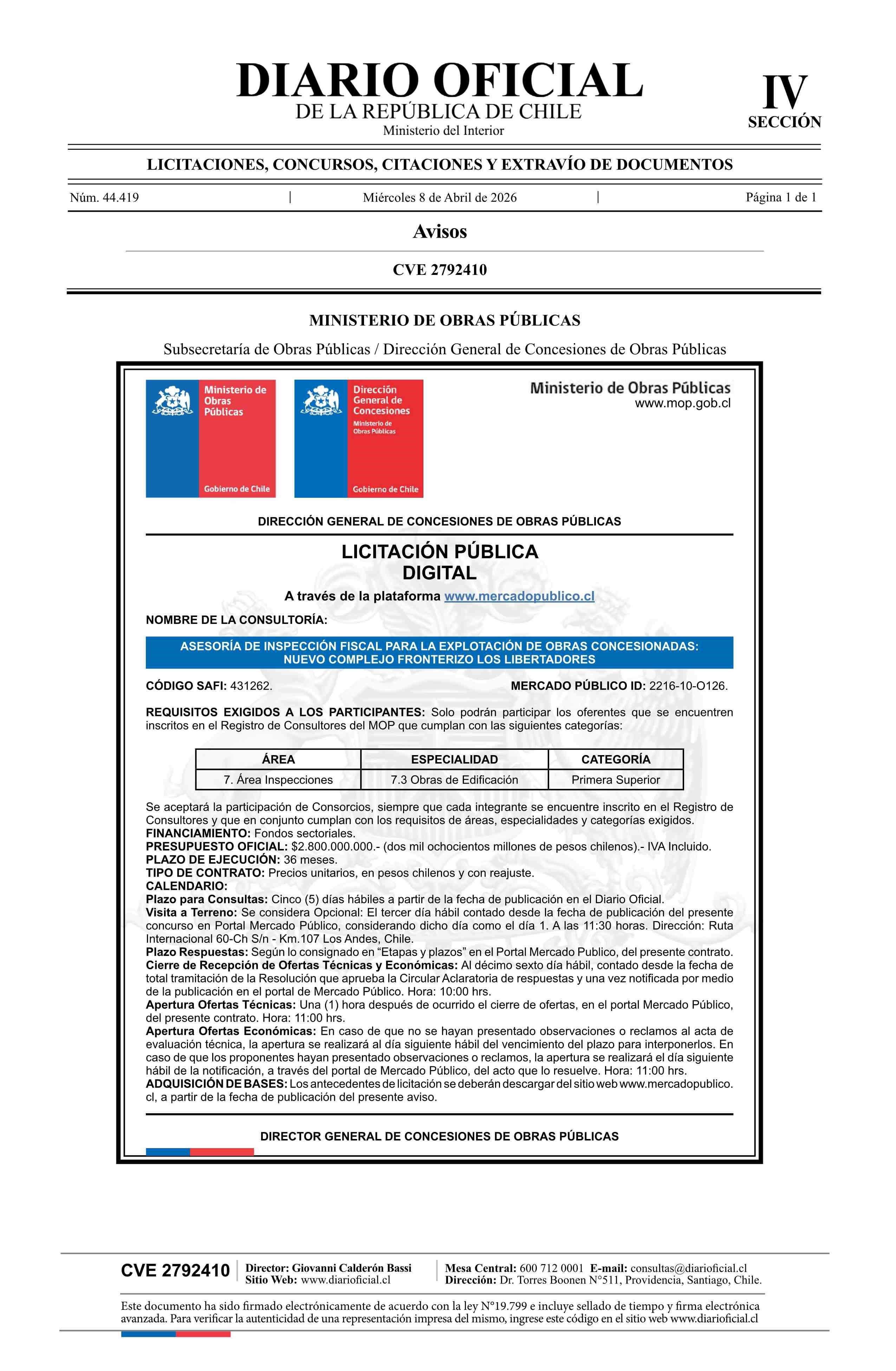 AVISO LICITACIONES: Asesoría de Inspección Fiscal para la Explotación de Obras Concesionadas: Nuevo Complejo Fronterizo Los Libertadores 08-04-2026 Diario Oficial Edición Electrónica |