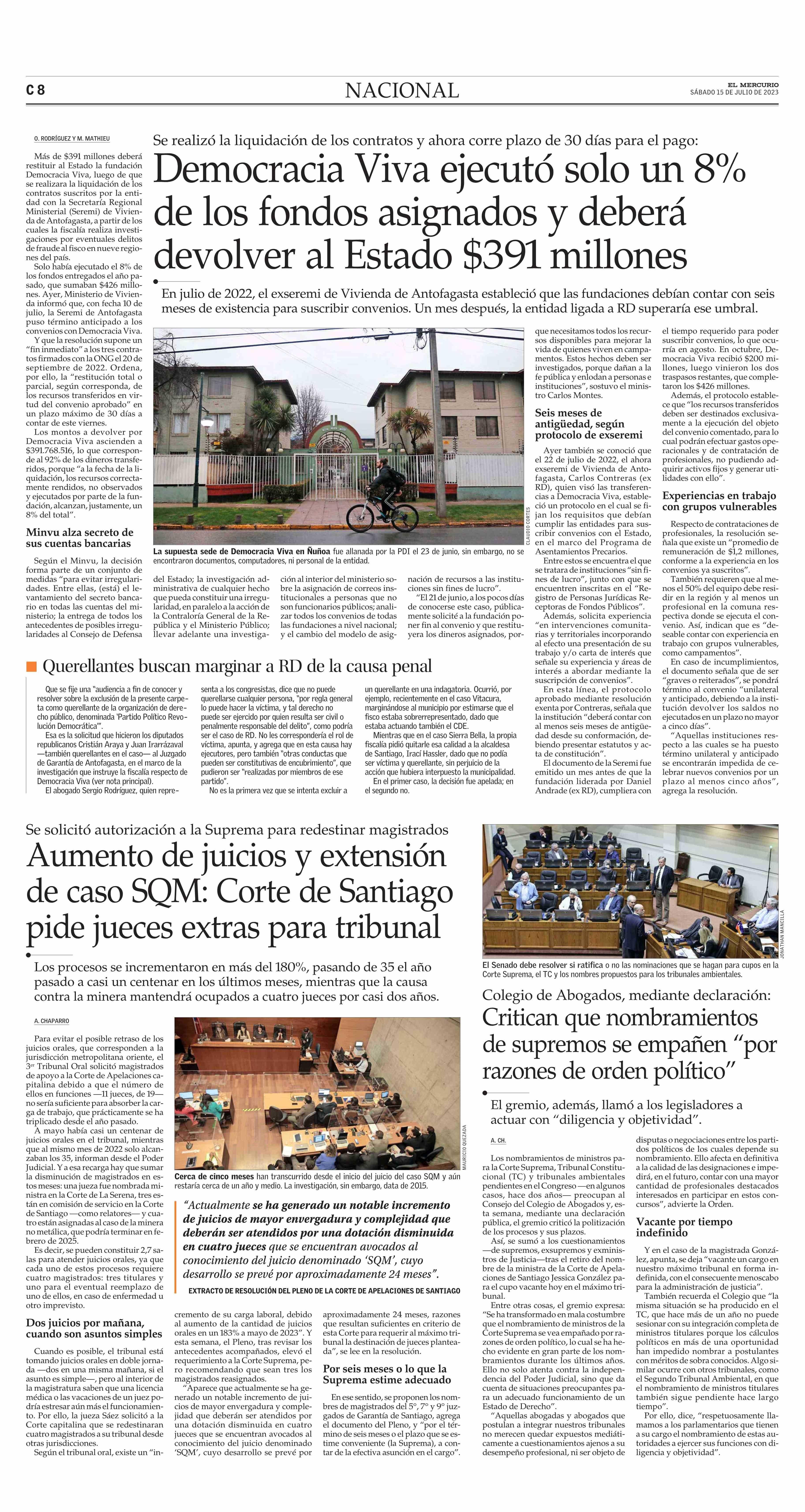 Democracia Viva ejecutó solo un 8% de los fondos asignados y deberá devolver al Estado $391 millones 15-07-2023 El Mercurio |