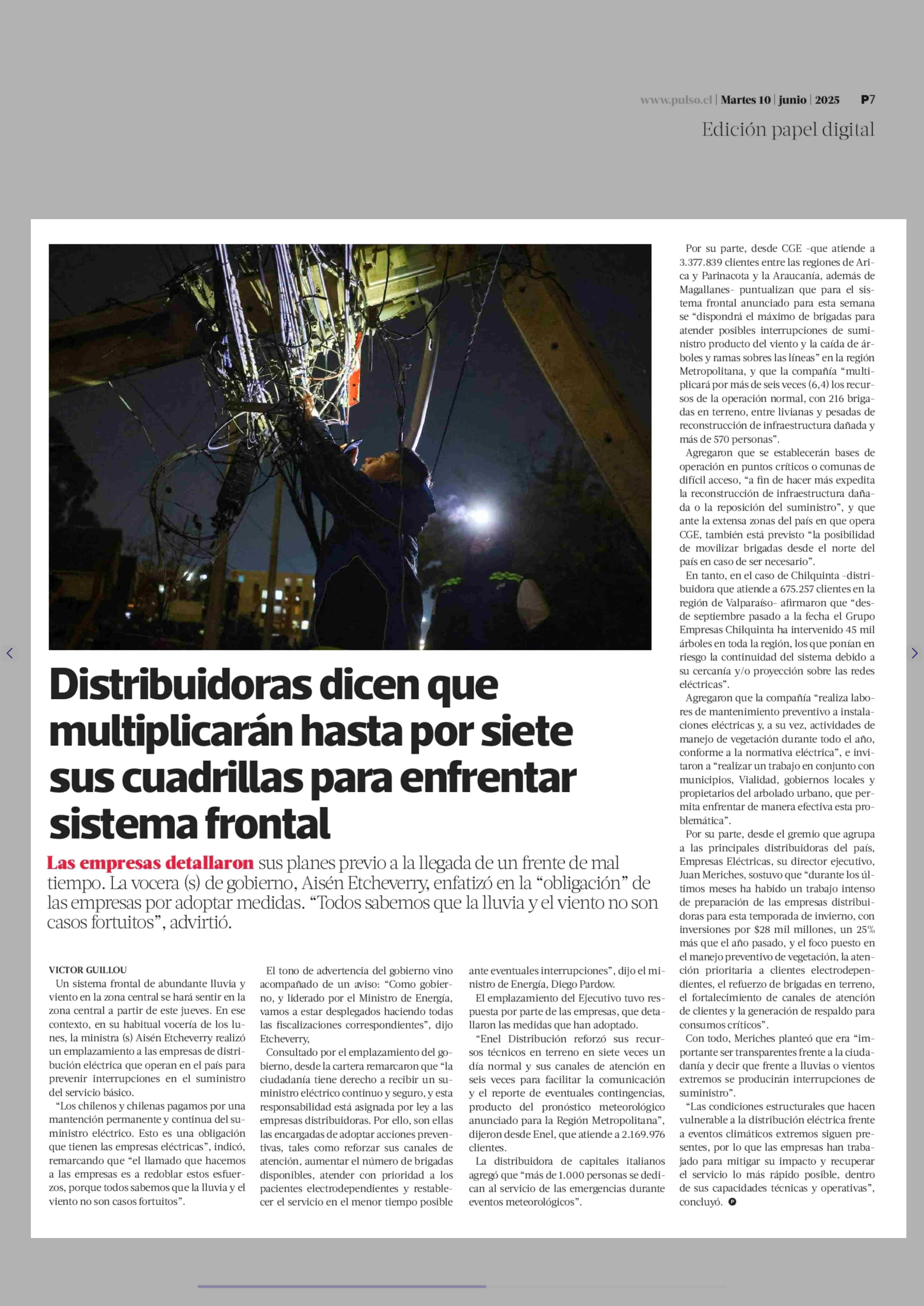Distribuidoras dicen que multiplicarán hasta por siete sus cuadrillas para enfrentar sistema frontal 10-06-2025 La Tercera |