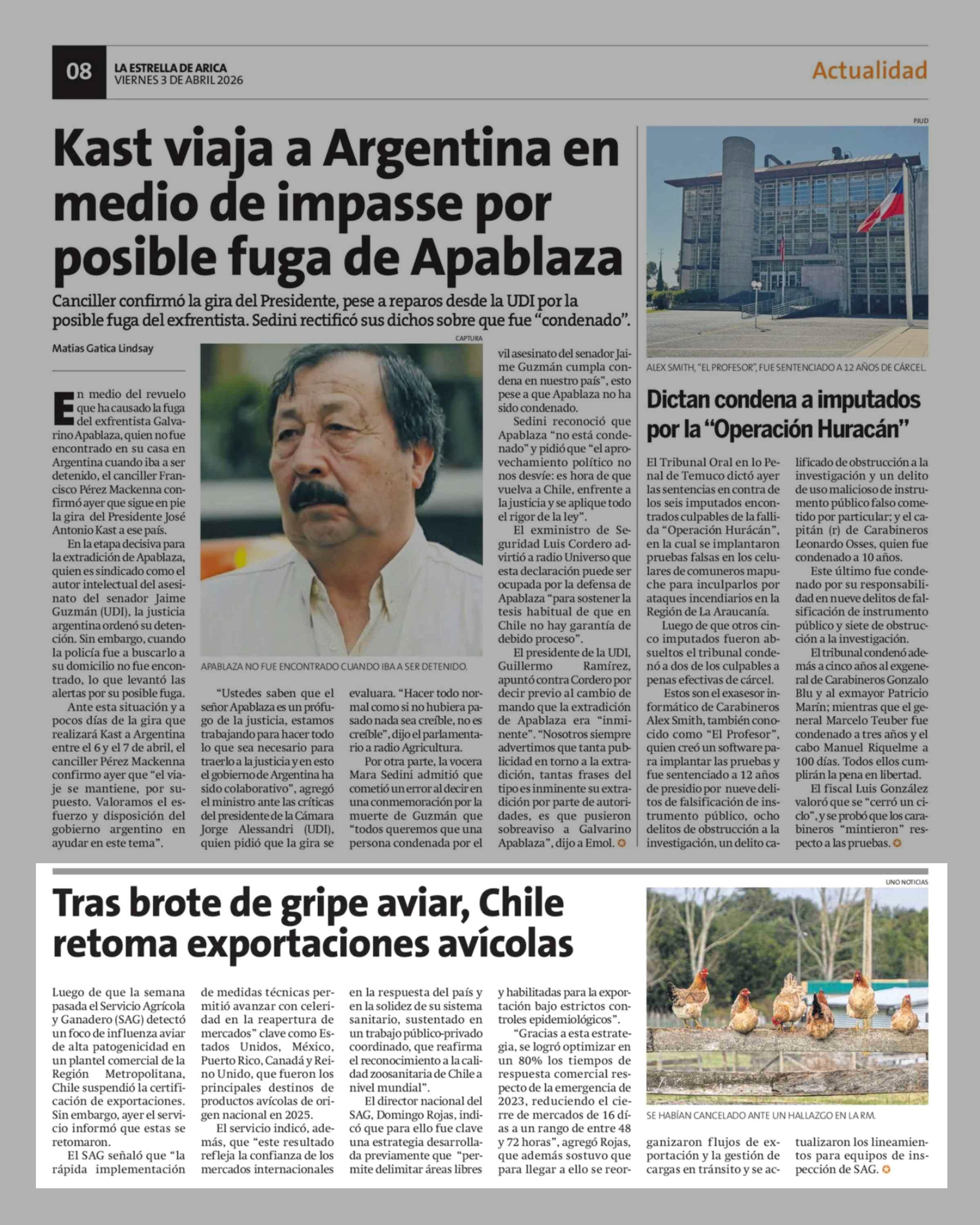 Tras brote de gripe aviar, Chile retoma exportaciones avícolas 03-04-2026 La Estrella de Arica |