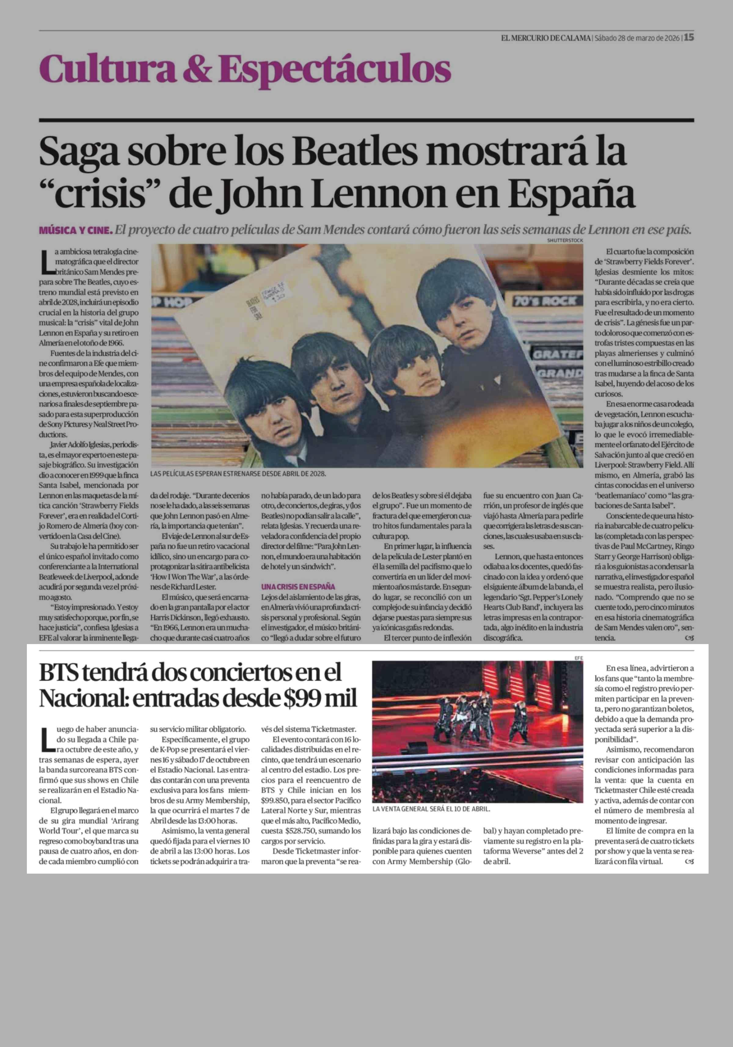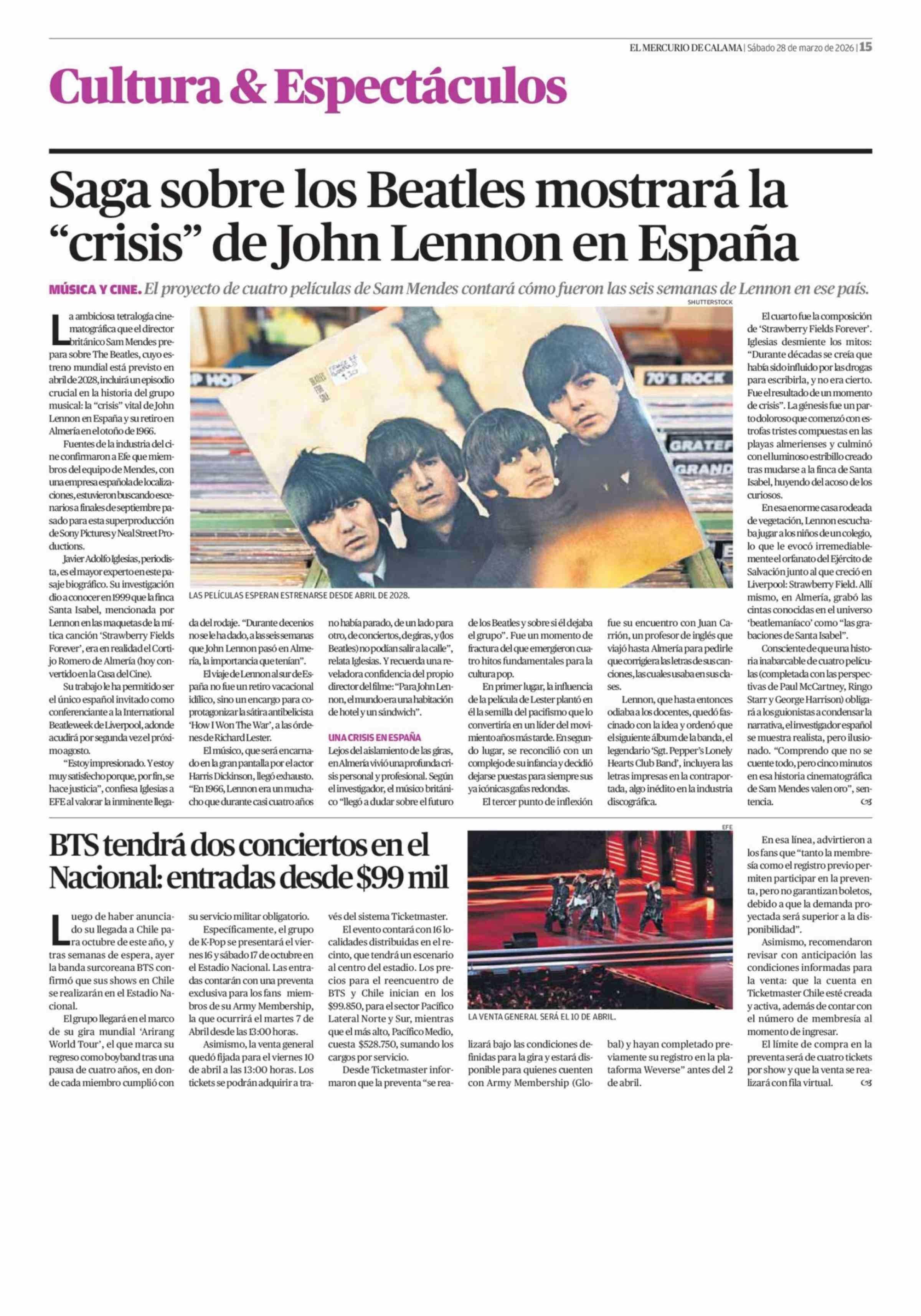 BTS tendrá dos conciertos en el Nacional: entradas desde $99 mil 28-03-2026 El Mercurio de Calama |