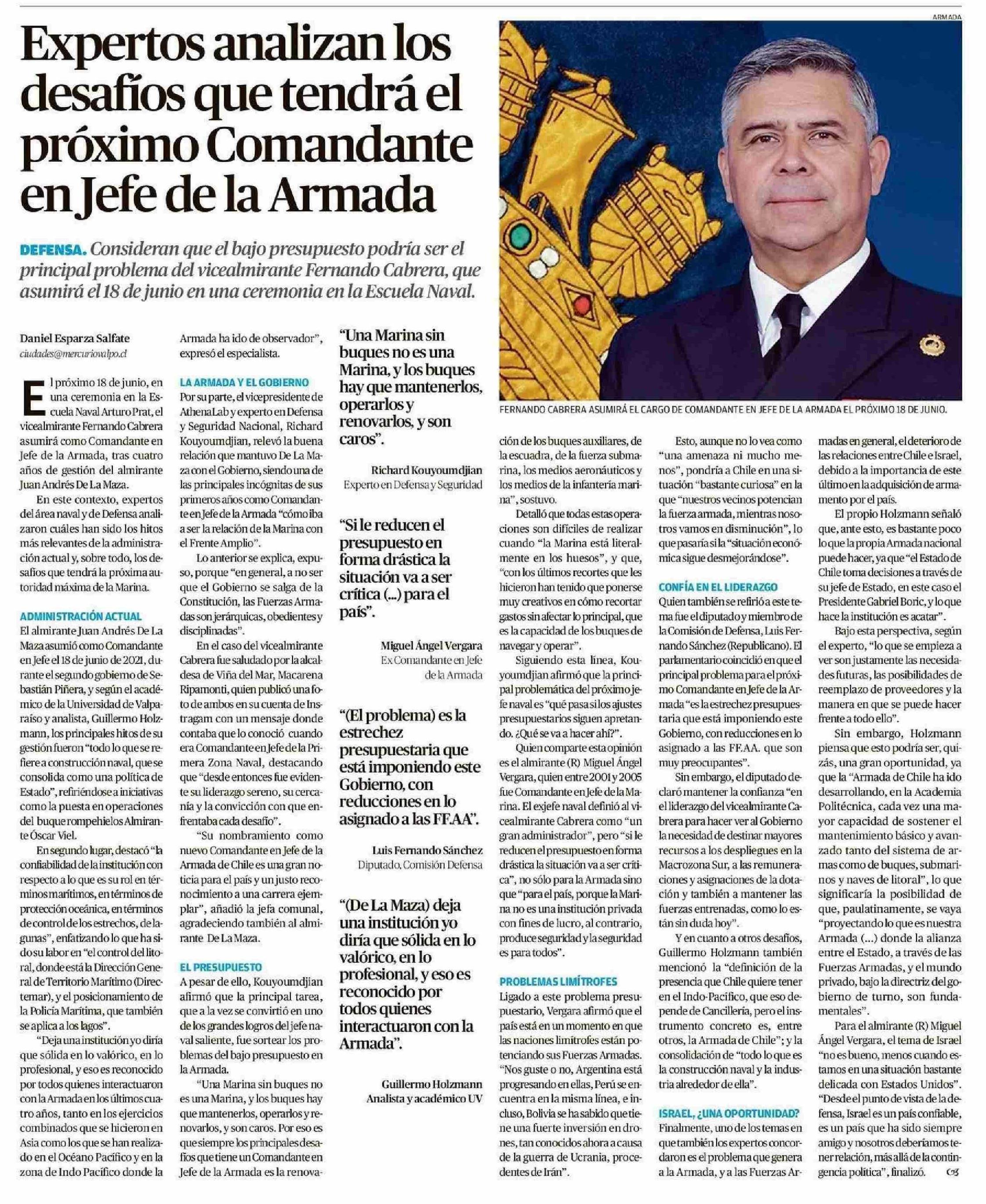 Expertos analizan los desafíos que tendrá el próximo Comandante en Jefe de la Armada 09-06-2025 El Mercurio de Valparaíso |
