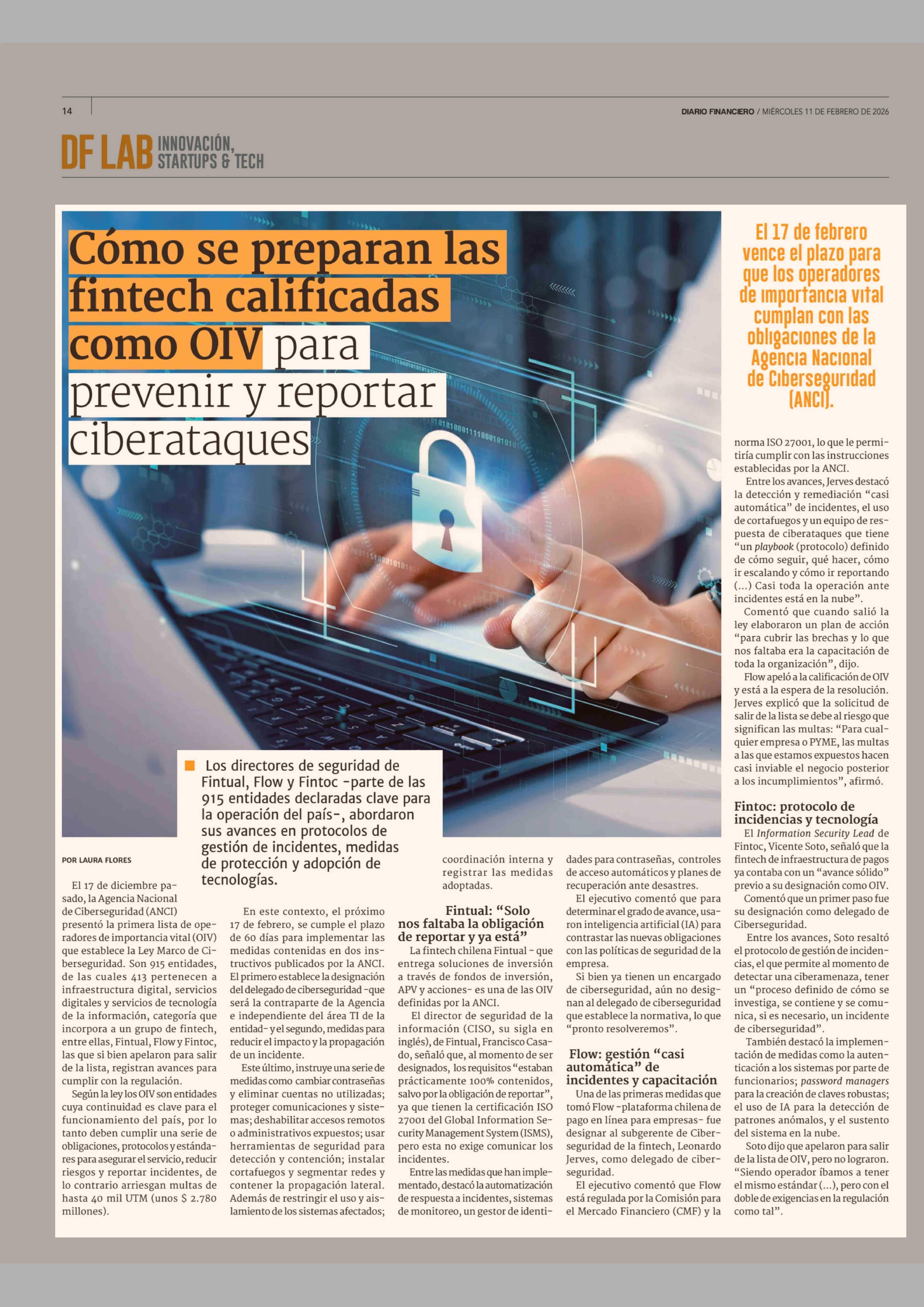 Cómo se preparan las fintech calificadas como OIV para prevenir y reportar ciberataques 11-02-2026 Diario Financiero |