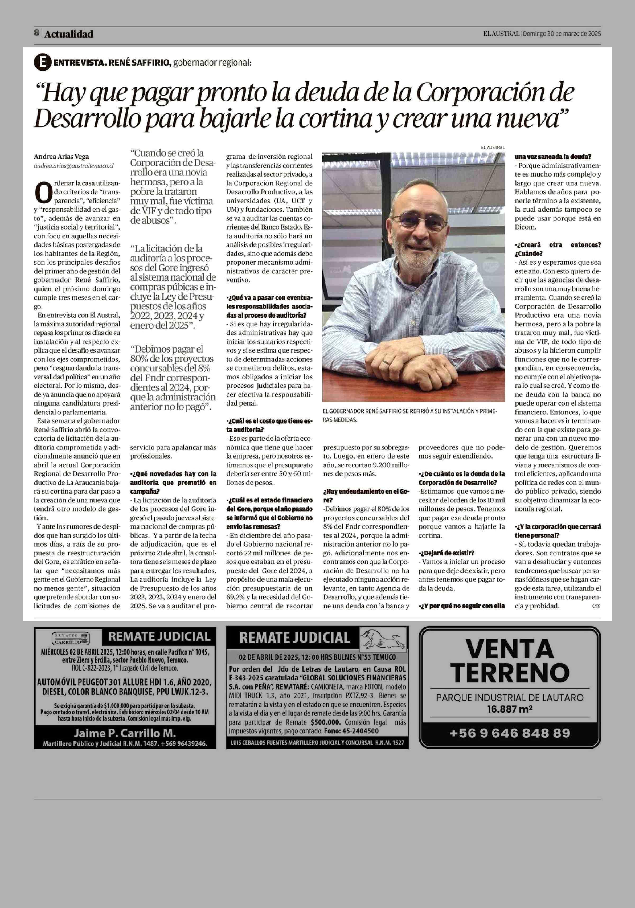 “Hay que pagar pronto la deuda de la Corporación de Desarrollo para bajarle la cortina y crear una nueva” 30-03-2025 El Austral de la Araucanía |