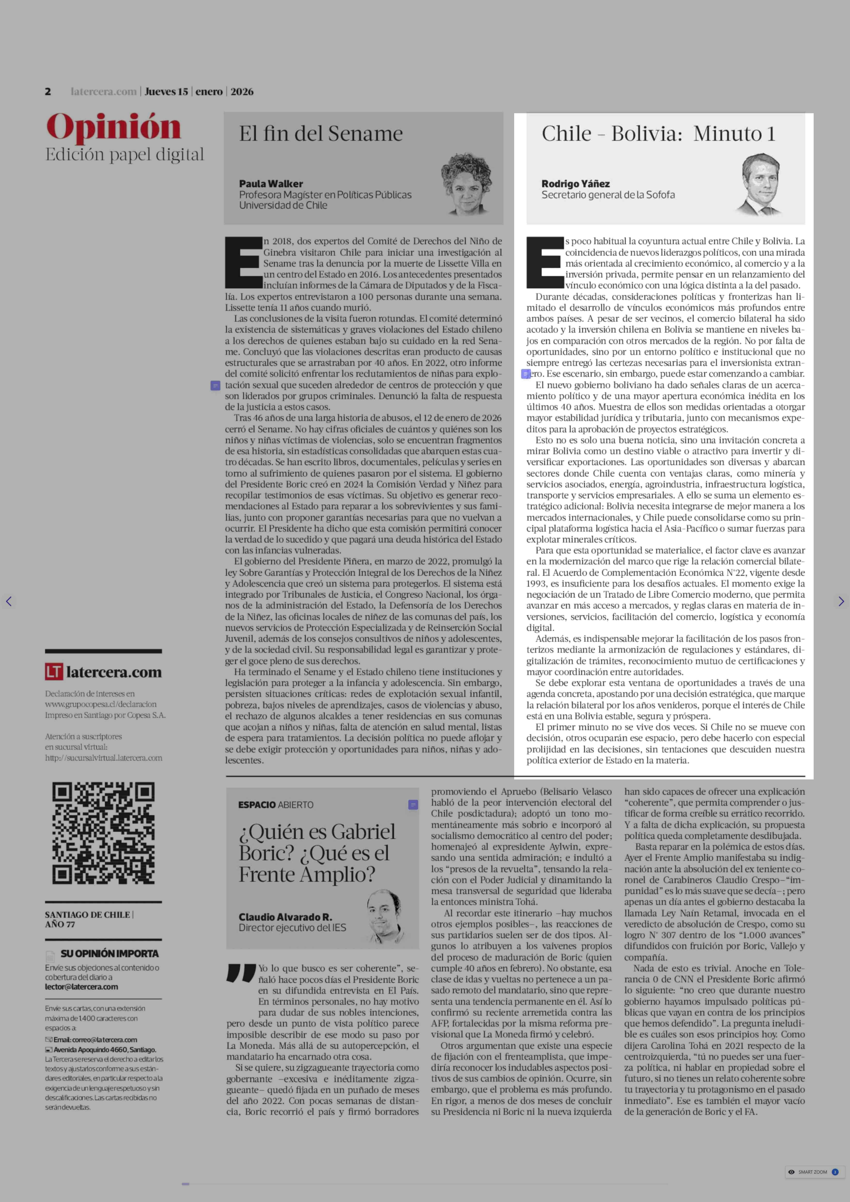 Columnas de Opinión: Chile - Bolivia: Minuto 1 15-01-2026 La Tercera |