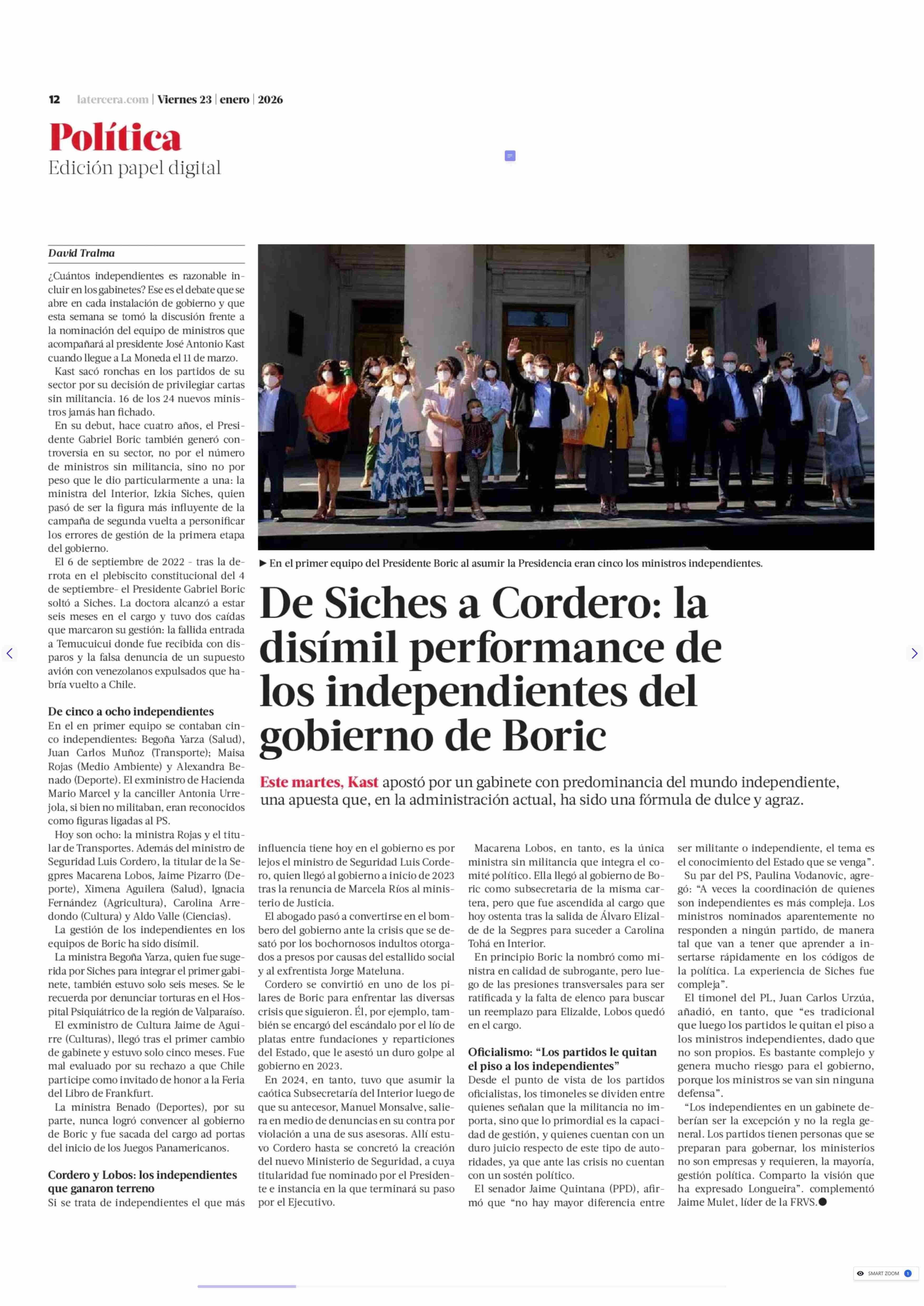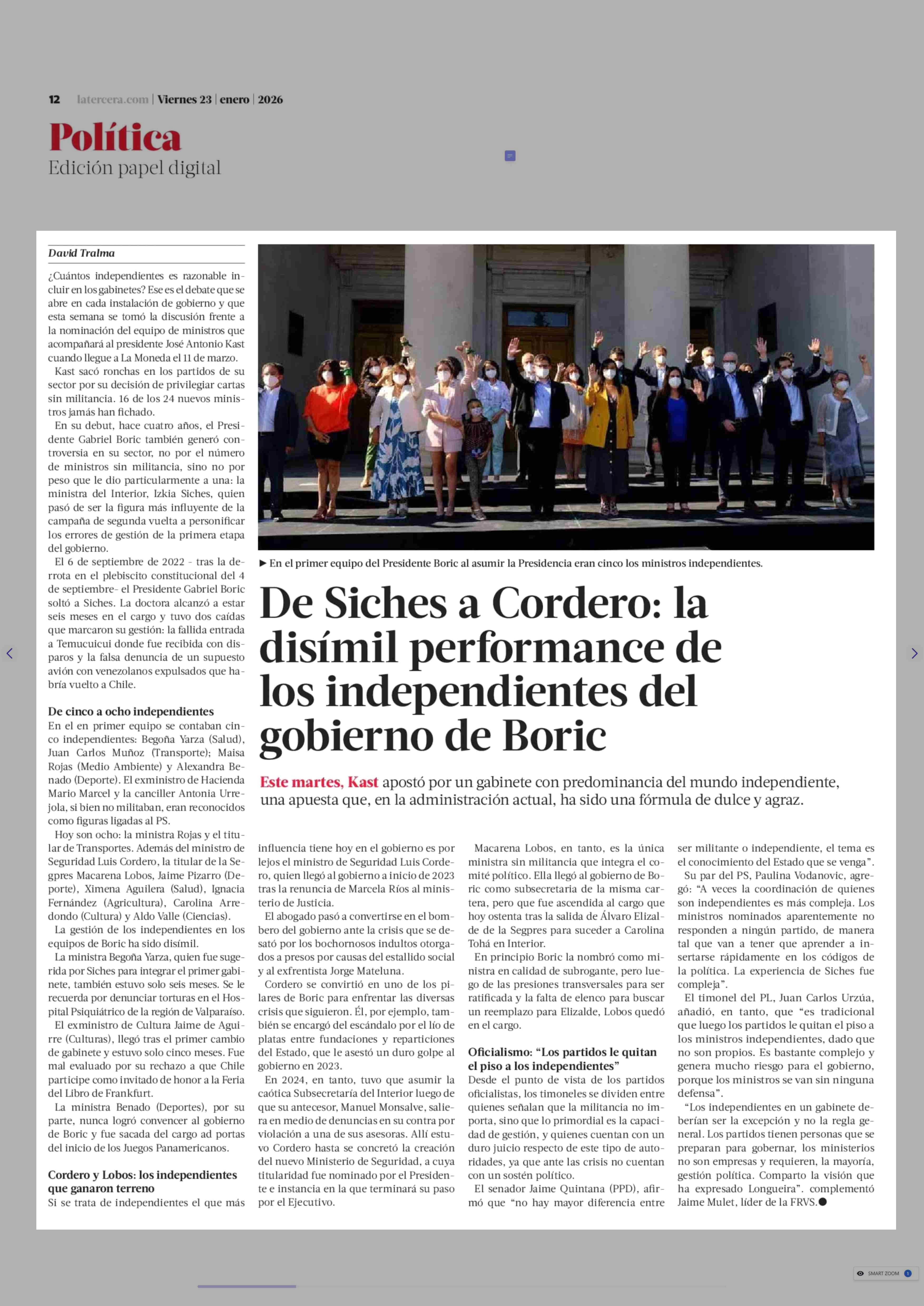 De Siches a Cordero: la disímil performance de los independientes del gobierno de Boric 23-01-2026 La Tercera |