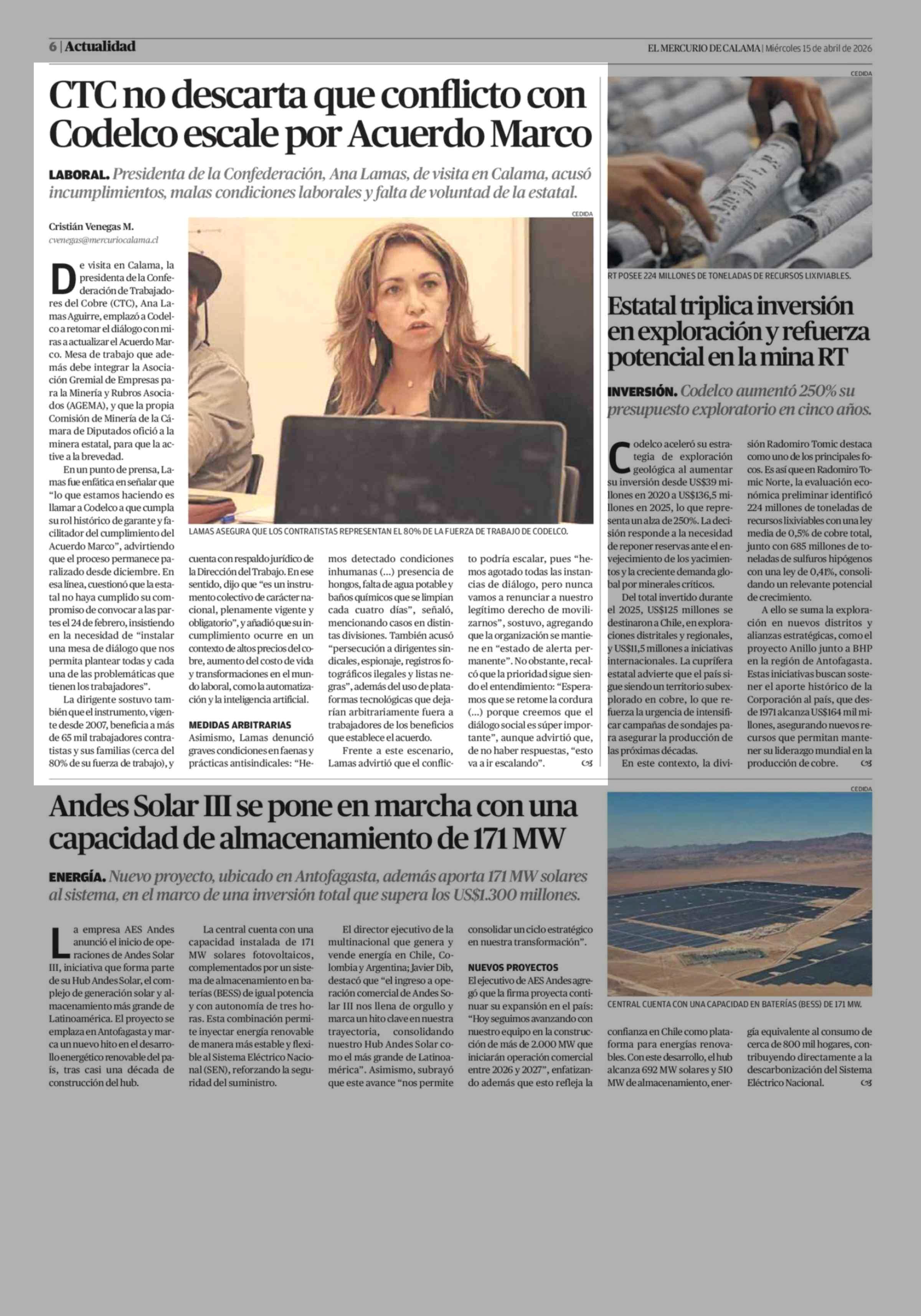 Título: CTC no descarta que conflicto con Codelco escale por Acuerdo Marco