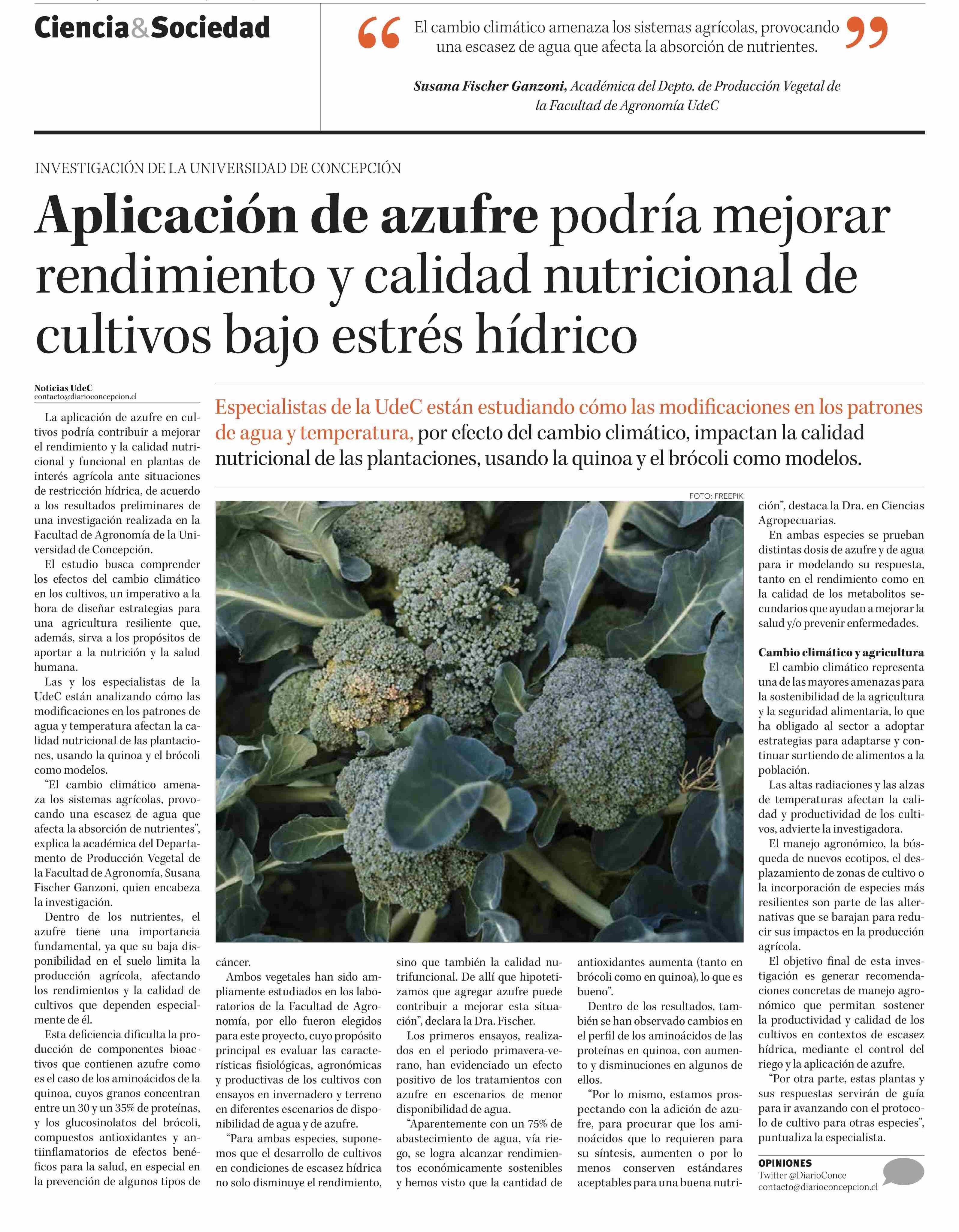 Aplicación de azufre podría mejorar rendimiento y calidad nutricional de cultivos bajo estrés hídrico 20-05-2025 Diario Concepción |