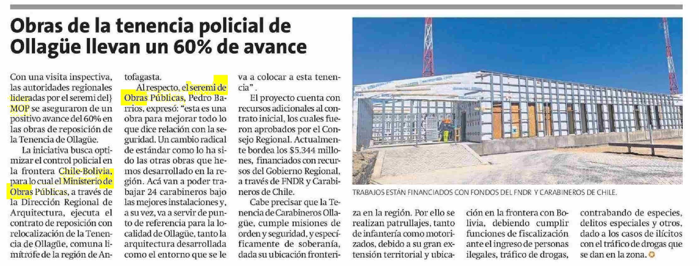 Obras de la tenencia policial de Ollagiie llevan un 60% de avance 04-06-2025 La Estrella de Antofagasta |