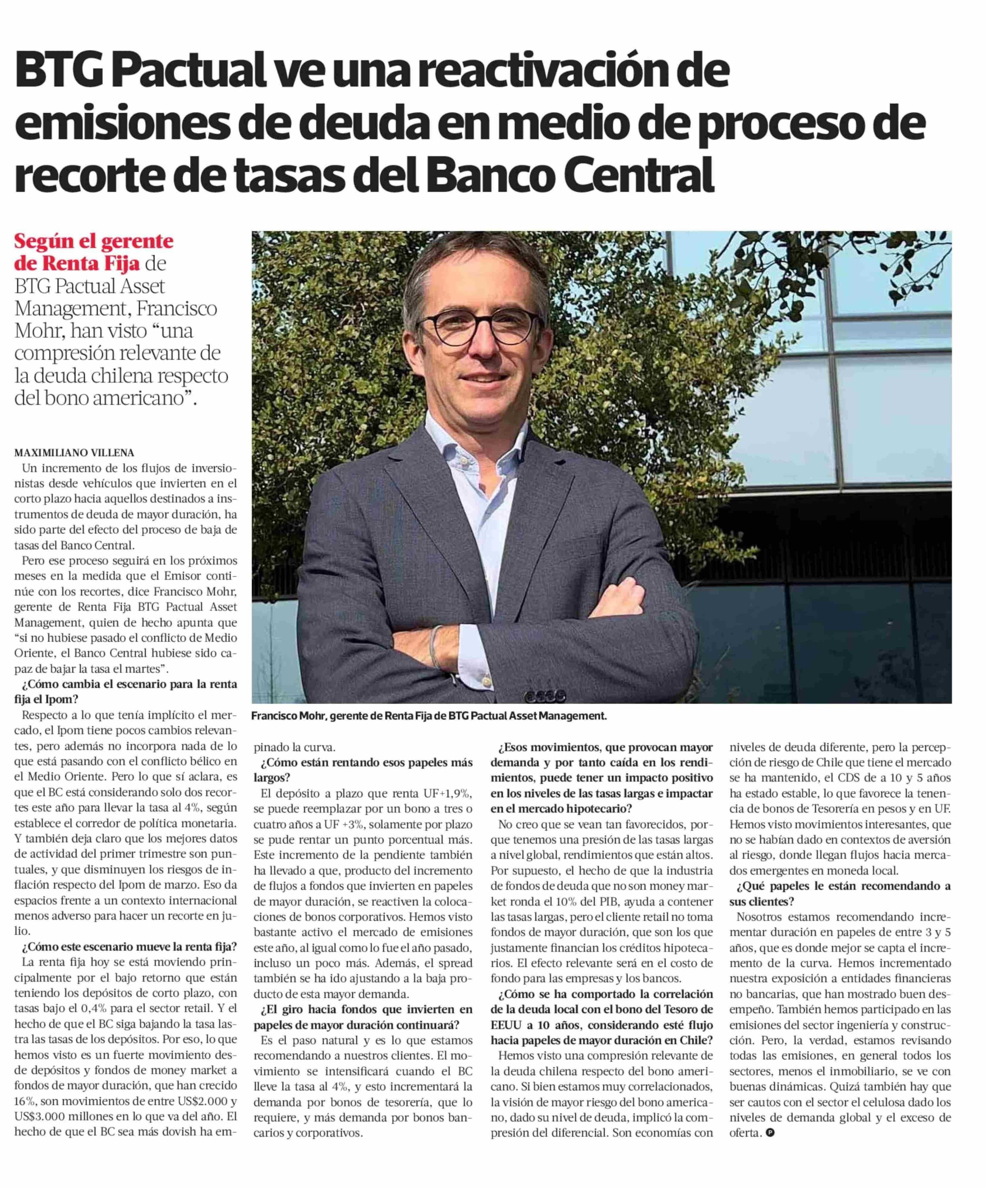 BTG Pactual ve una reactivación de emisiones de deuda en medio de proceso de recorte de tasas del Banco Central 20-06-2025 La Tercera |