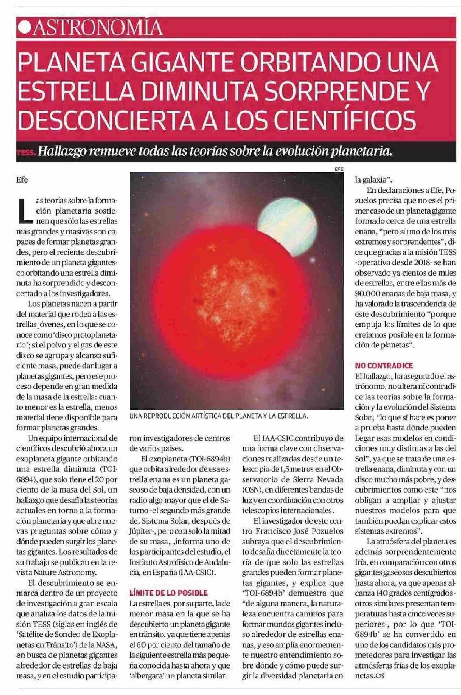PLANETA GIGANTE ORBITANDO UNA ESTRELLA DIMINUTA SORPRENDE Y DESCONCIERTA A LOS CIENTIFICOS 05-06-2025 El Mercurio de Antofagasta |