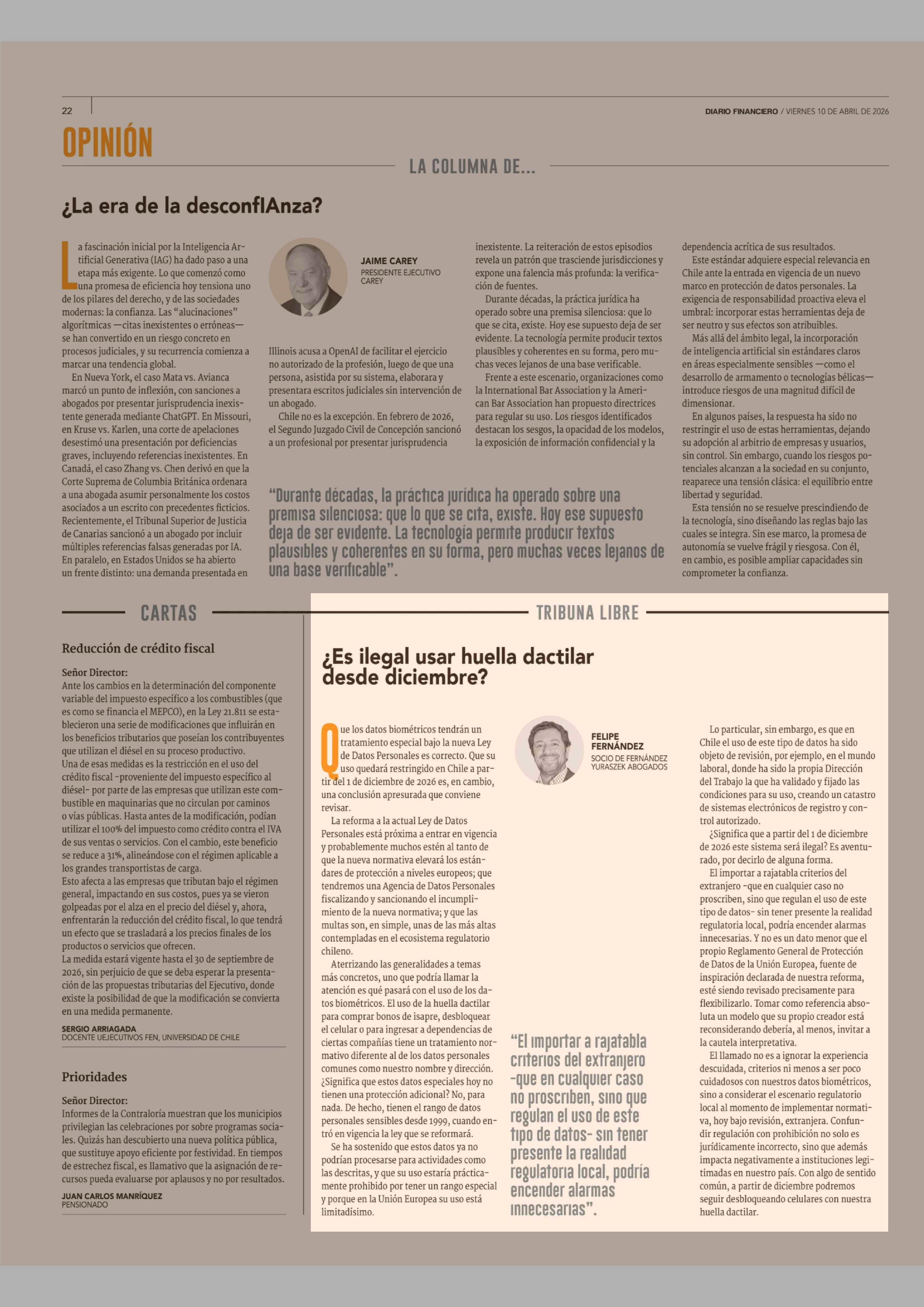 Columnas de Opinión: ¿Es ilegal usar huella dactilar desde diciembre? 10-04-2026 Diario Financiero |