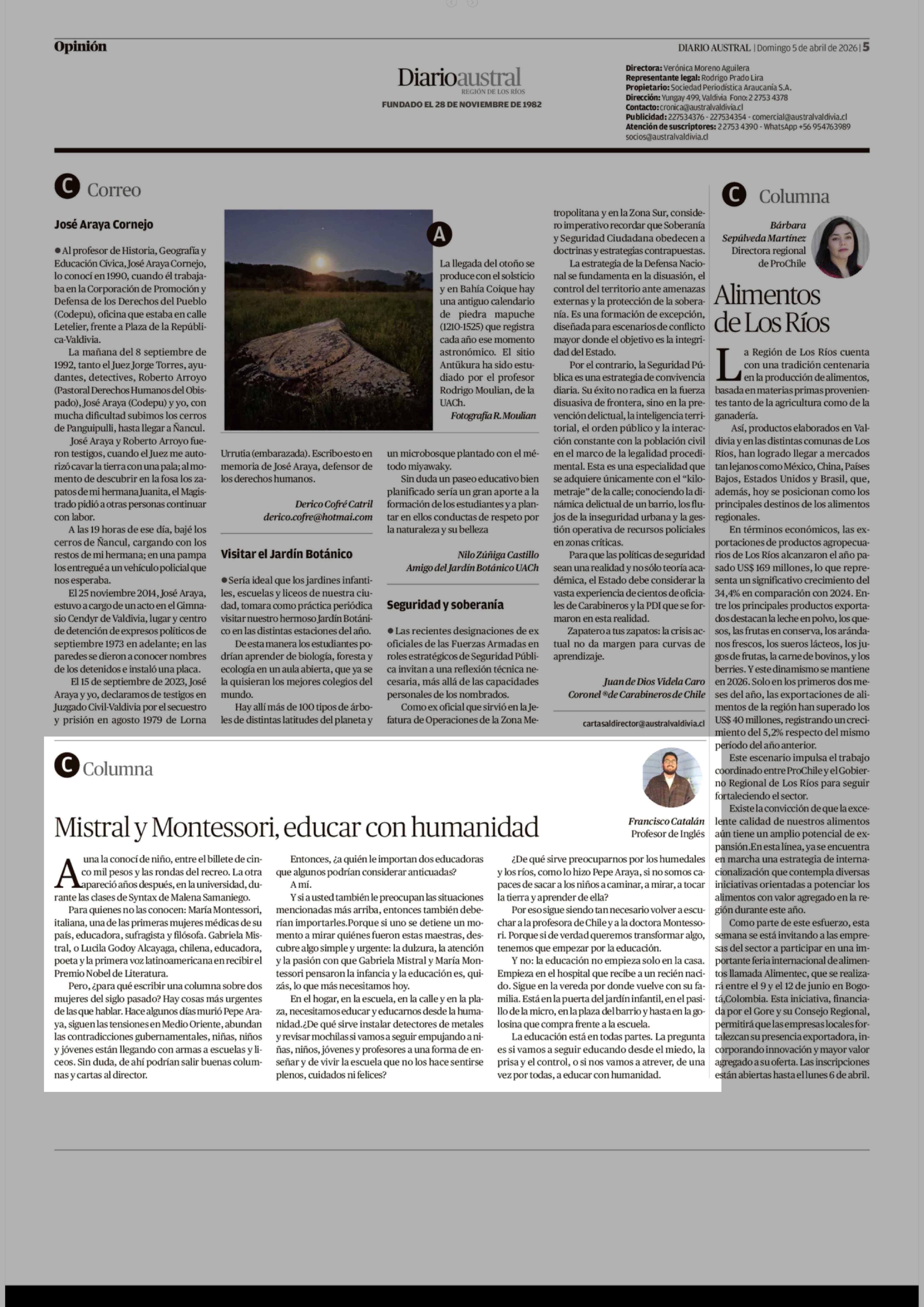 Columnas de Opinión: Mistral y Montessori, educar con humanidad 05-04-2026 Diario Austral Región de Los Ríos |
