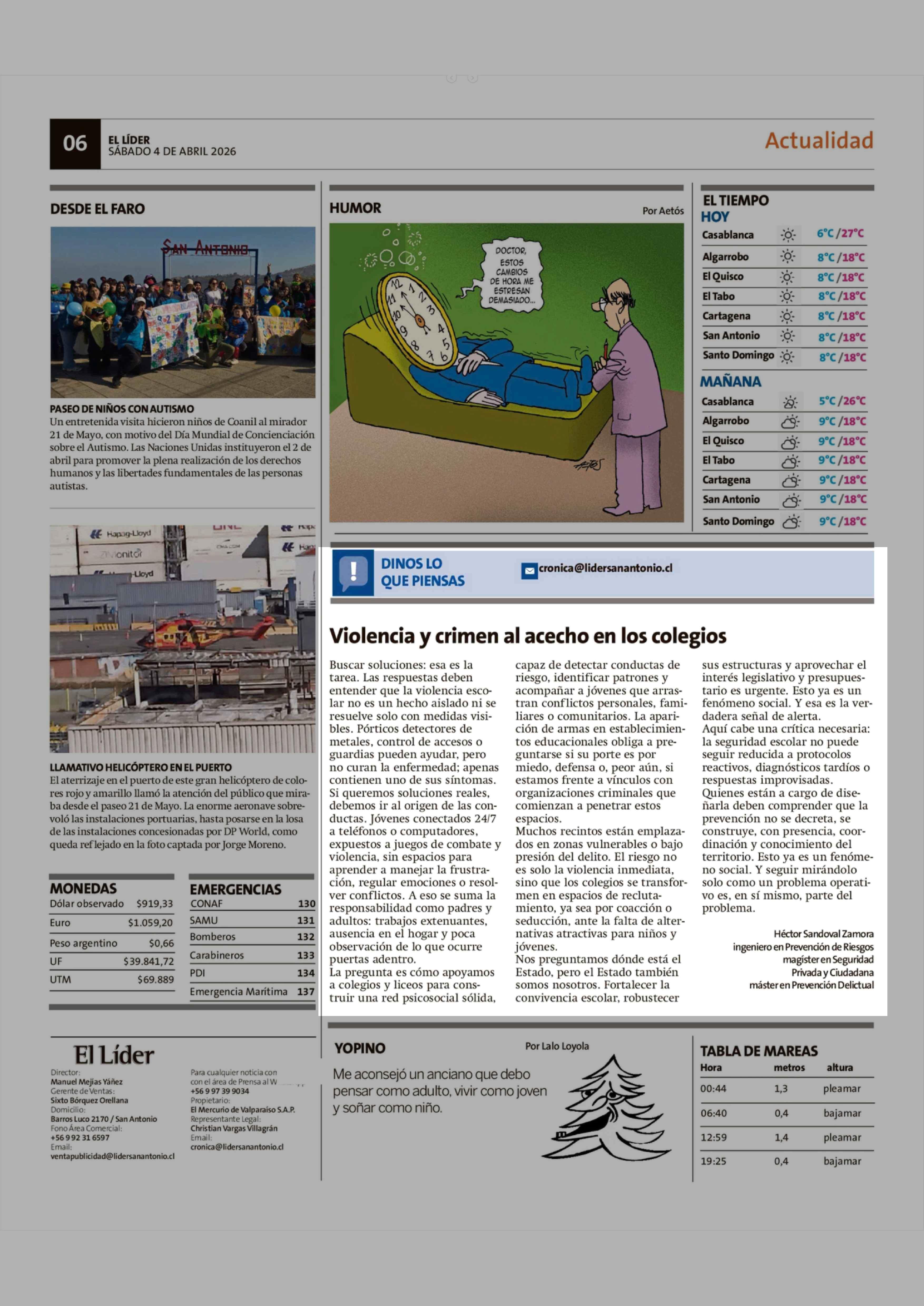 Cartas: Violencia y crimen al acecho en los colegios 04-04-2026 El Líder |