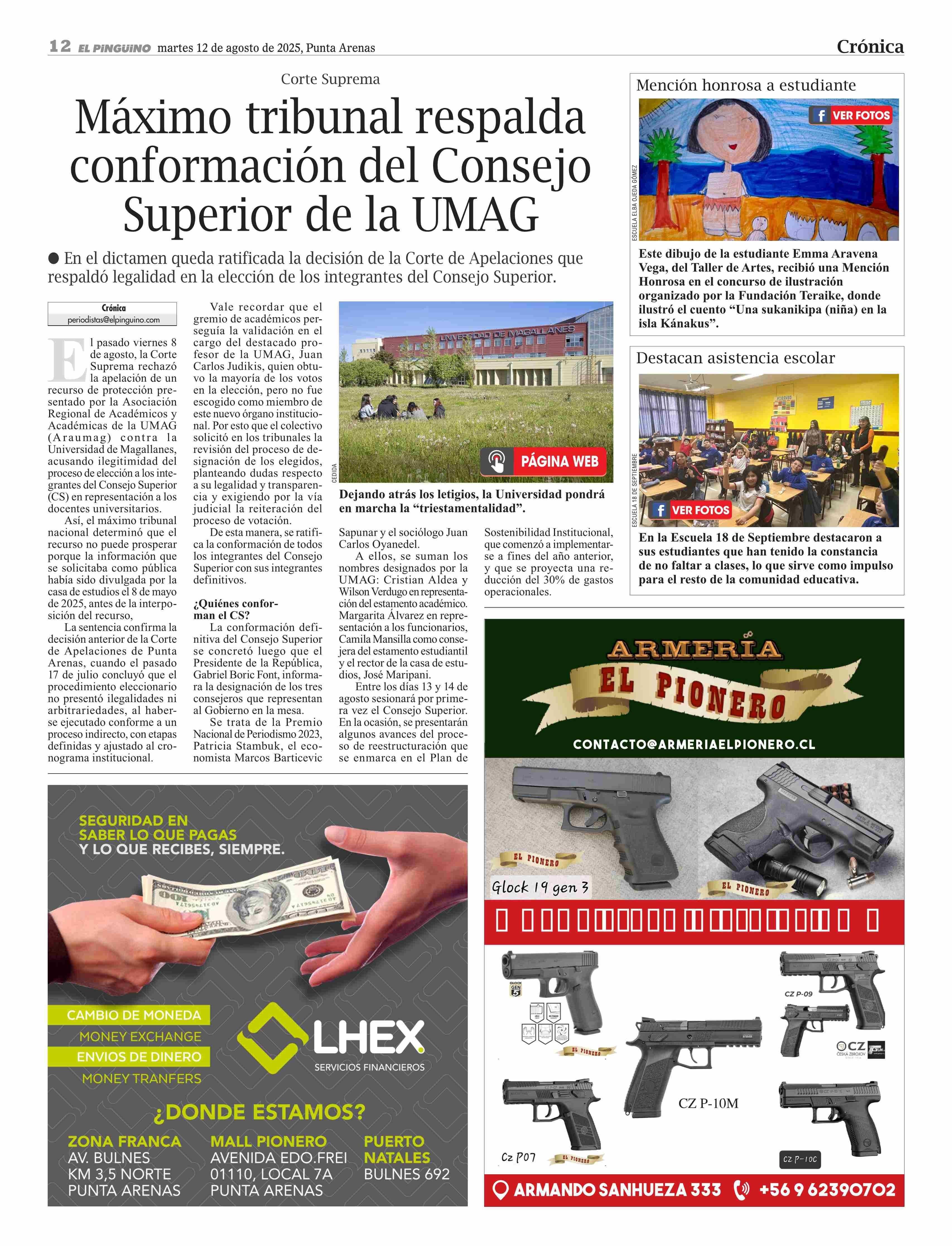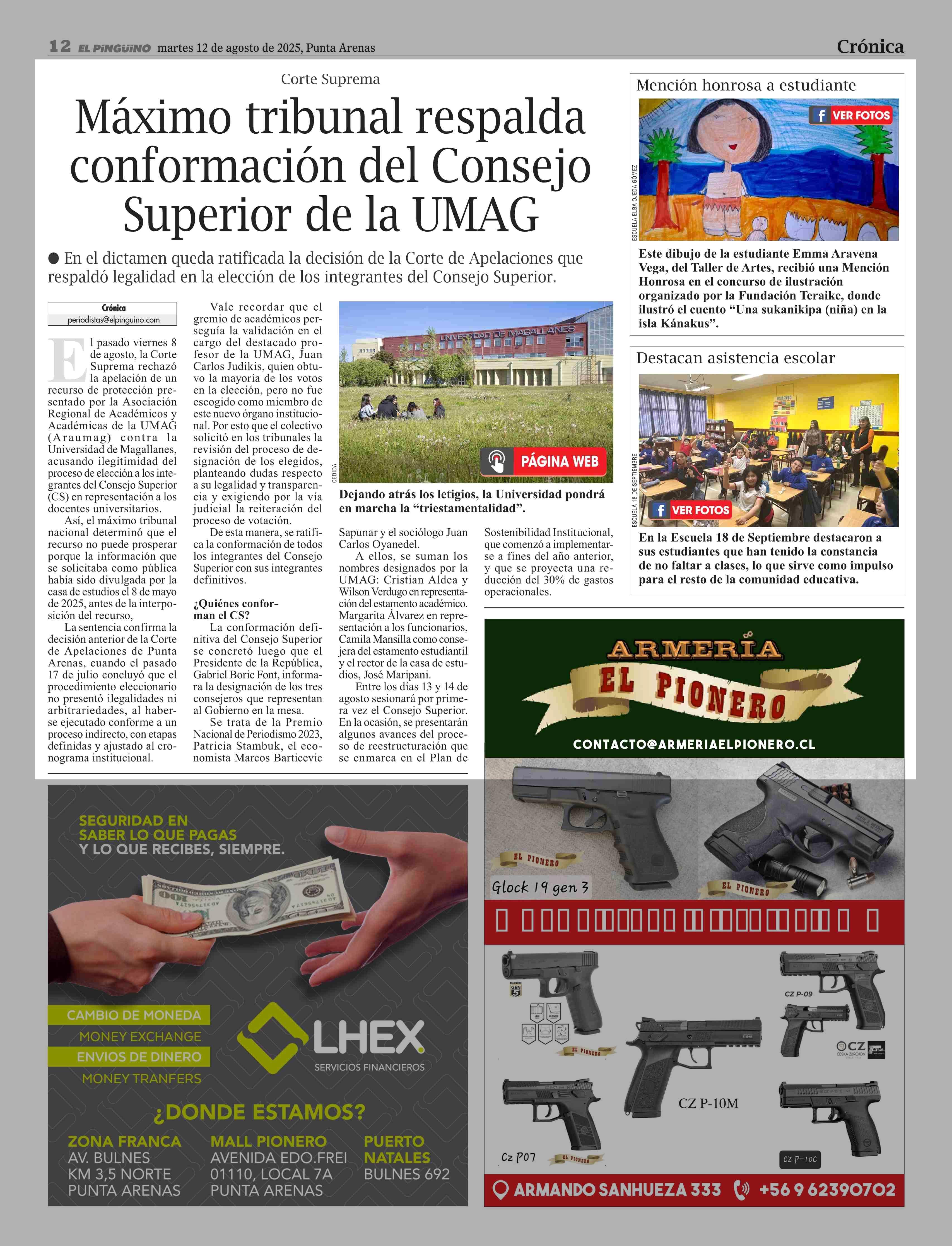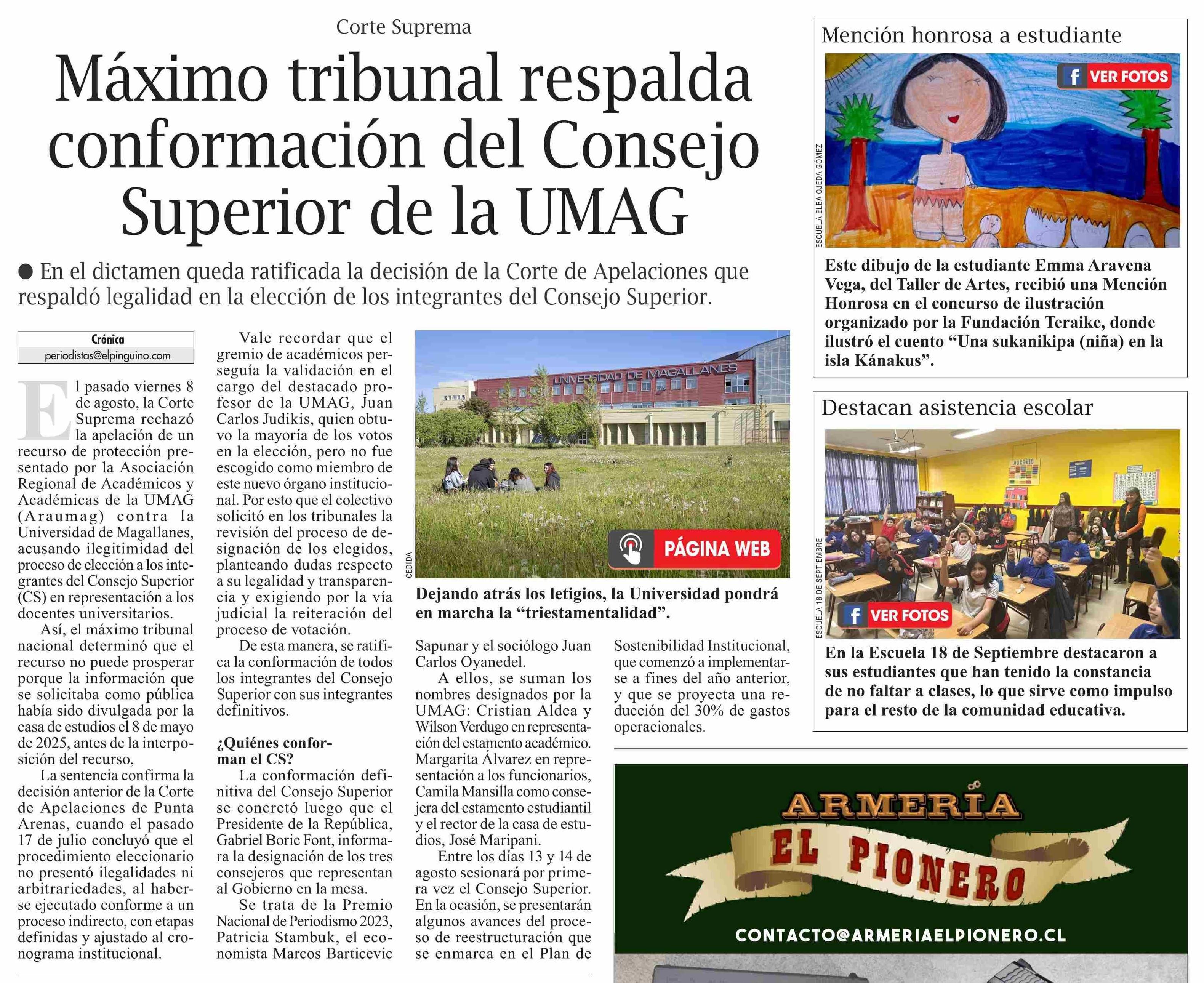 Máximo tribunal respalda conformación del Consejo Superior de la UMAG 12-08-2025 El Pingüino |
