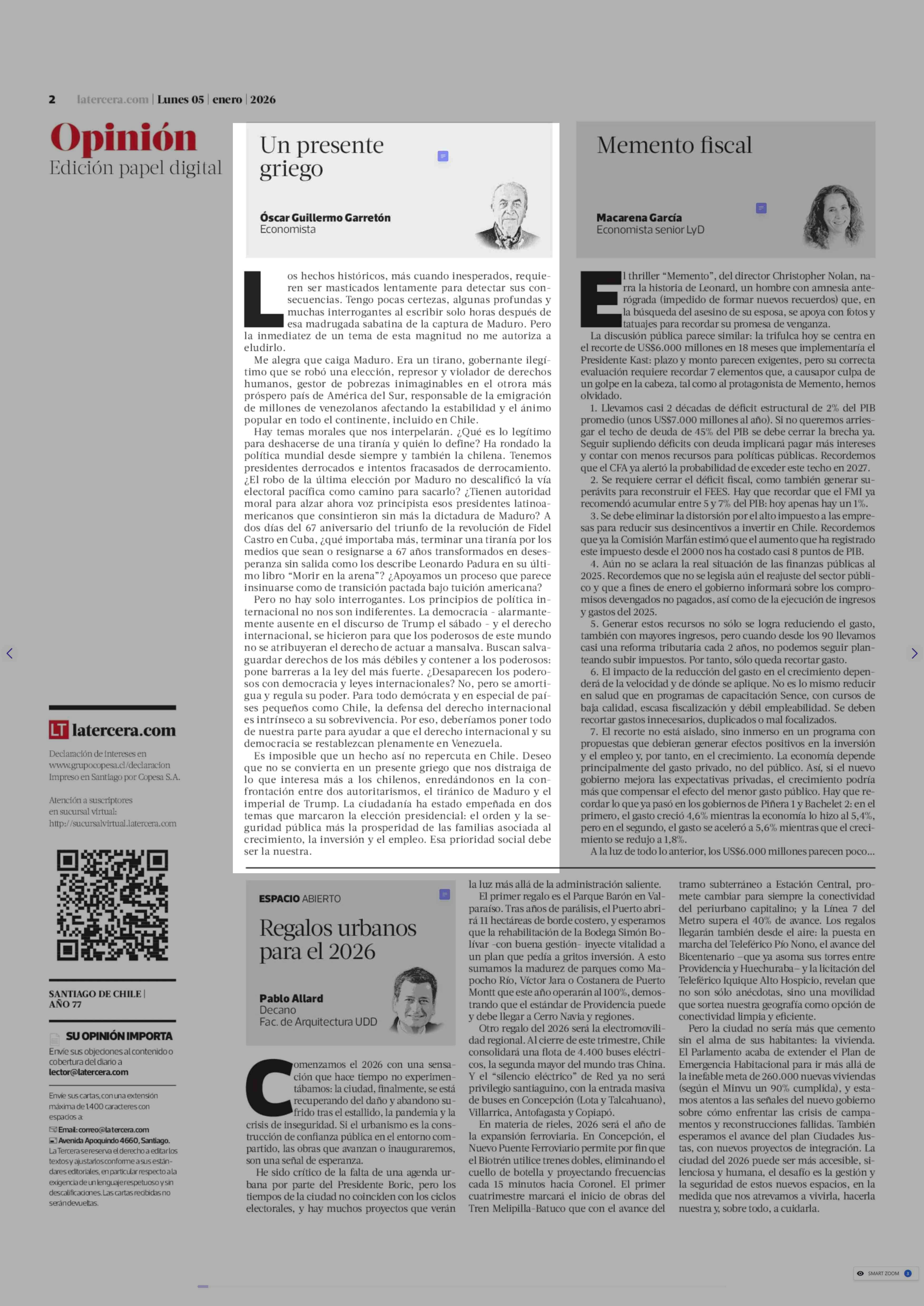 Columnas de Opinión: Un presente griego 05-01-2026 La Tercera |