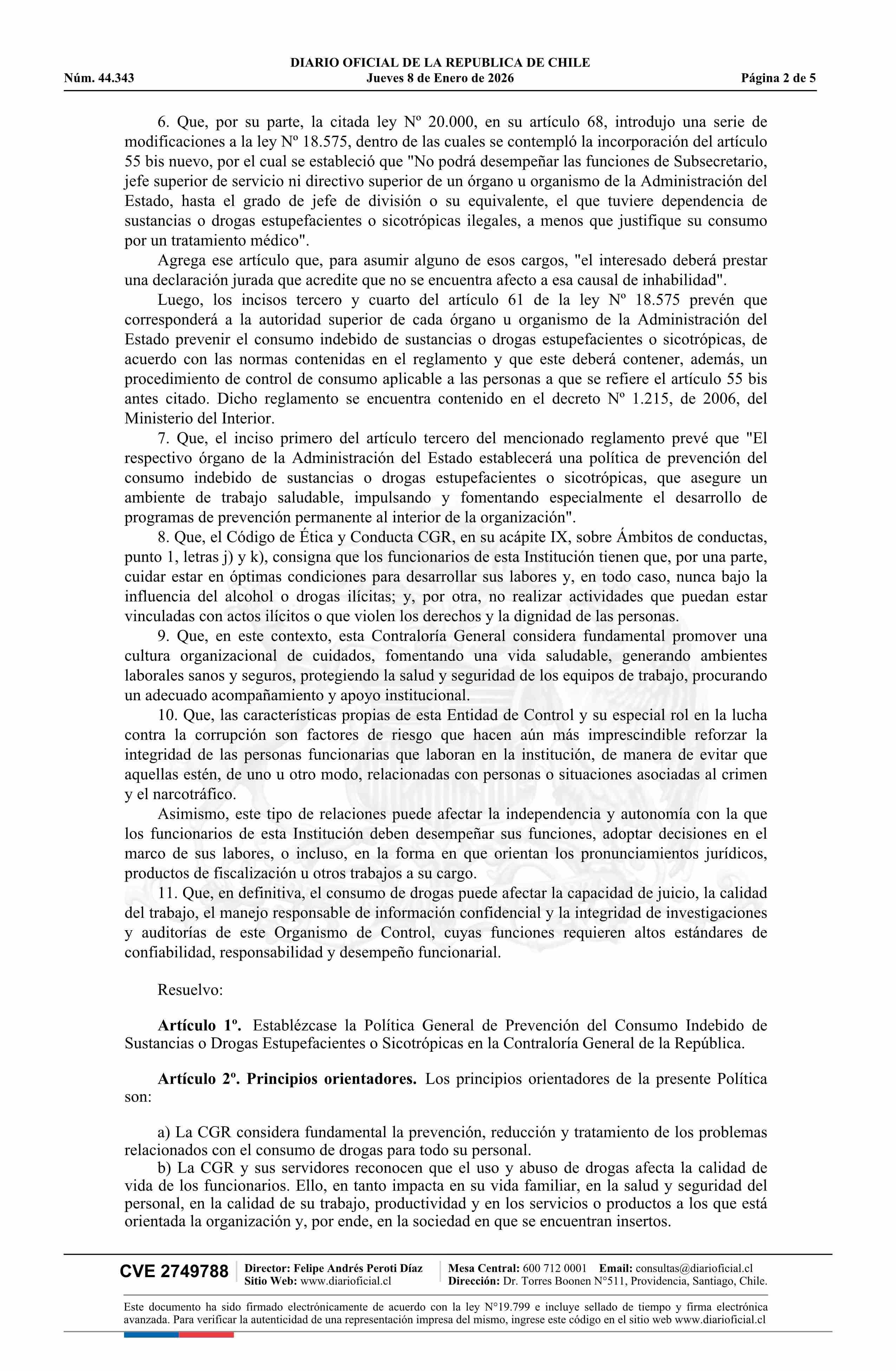 Resolución exenta número 2.453, de 2025.- Establece política general de prevención del consumo de drogas en la Contraloría General de la República