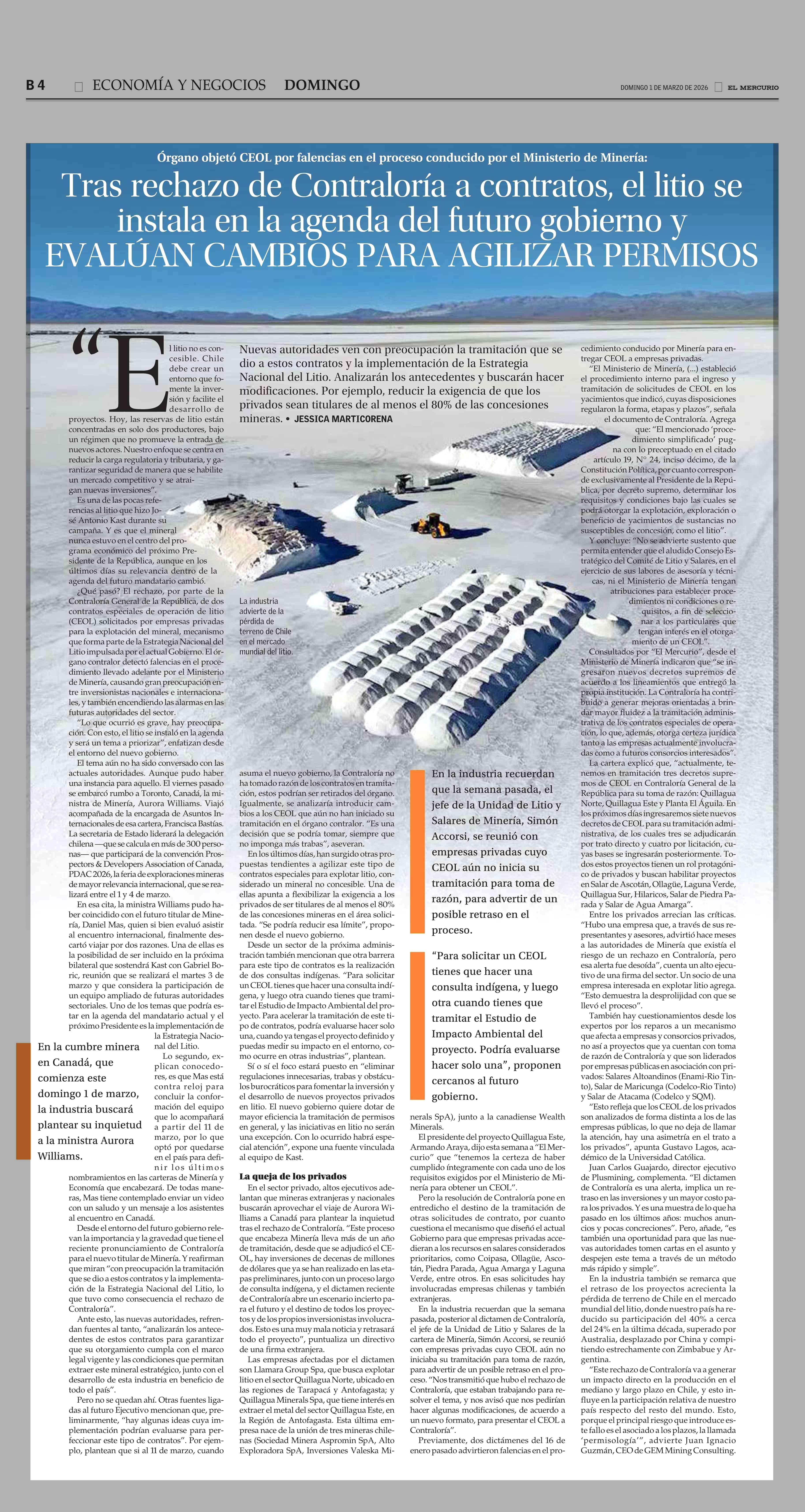 Título: Tras rechazo de Contraloría a contratos, el litio se instala en la agenda del futuro gobierno y EVALÚAN CAMBIOS PARA AGILIZAR PERMISOS