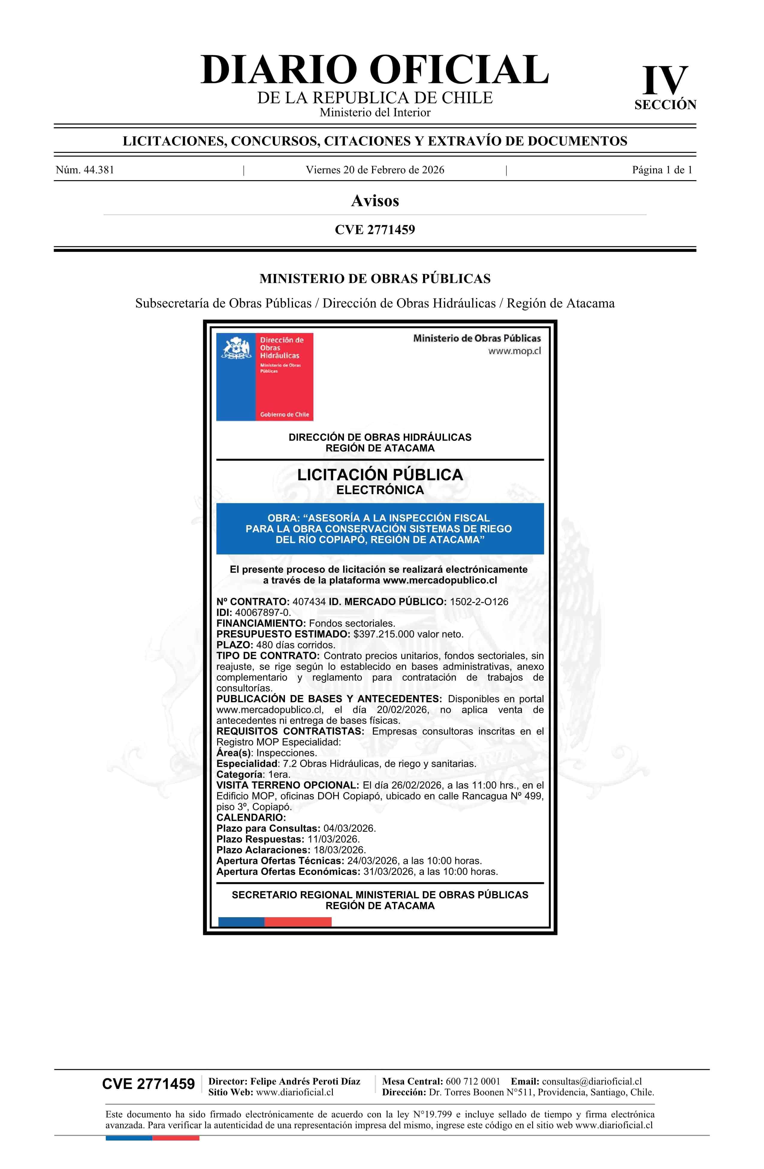 AVISO LICITACIONES: Asesoría a la Inspección Fiscal para la Obra Conservación Sistemas de Riego del Río Copiapó, Región de Atacama 20-02-2026 Diario Oficial Edición Electrónica |