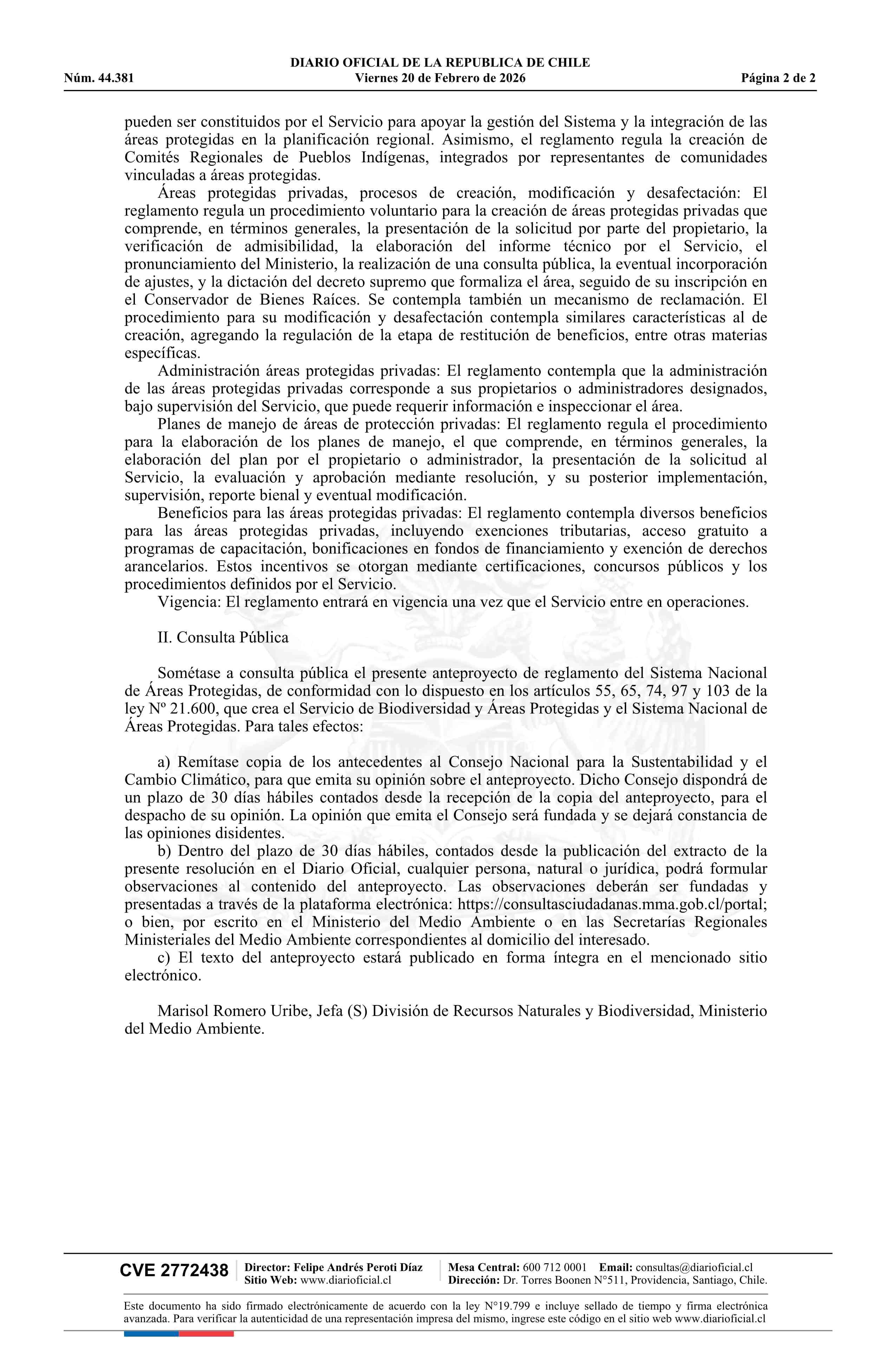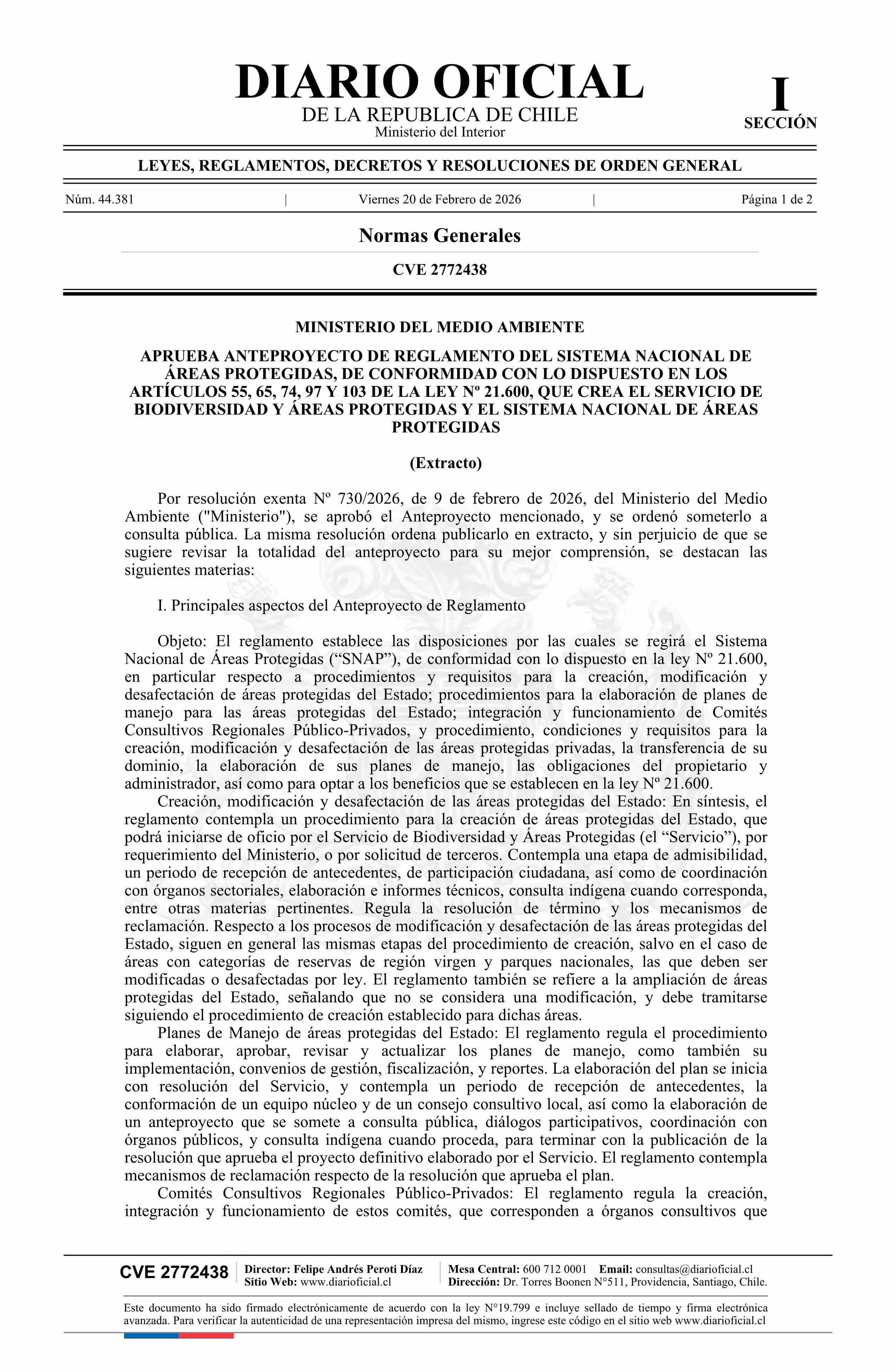 Título: Extracto de resolución exenta número 730, de 2026.- Aprueba anteproyecto de reglamento del Sistema Nacional de Áreas Protegidas, de conformidad con lo dispuesto en los artículos 55, 65, 74, 97 y 103 de la ley Nº 21.600, que crea el Servicio de Biodiversidad y Áreas Protegidas y el Sistema Nacional d