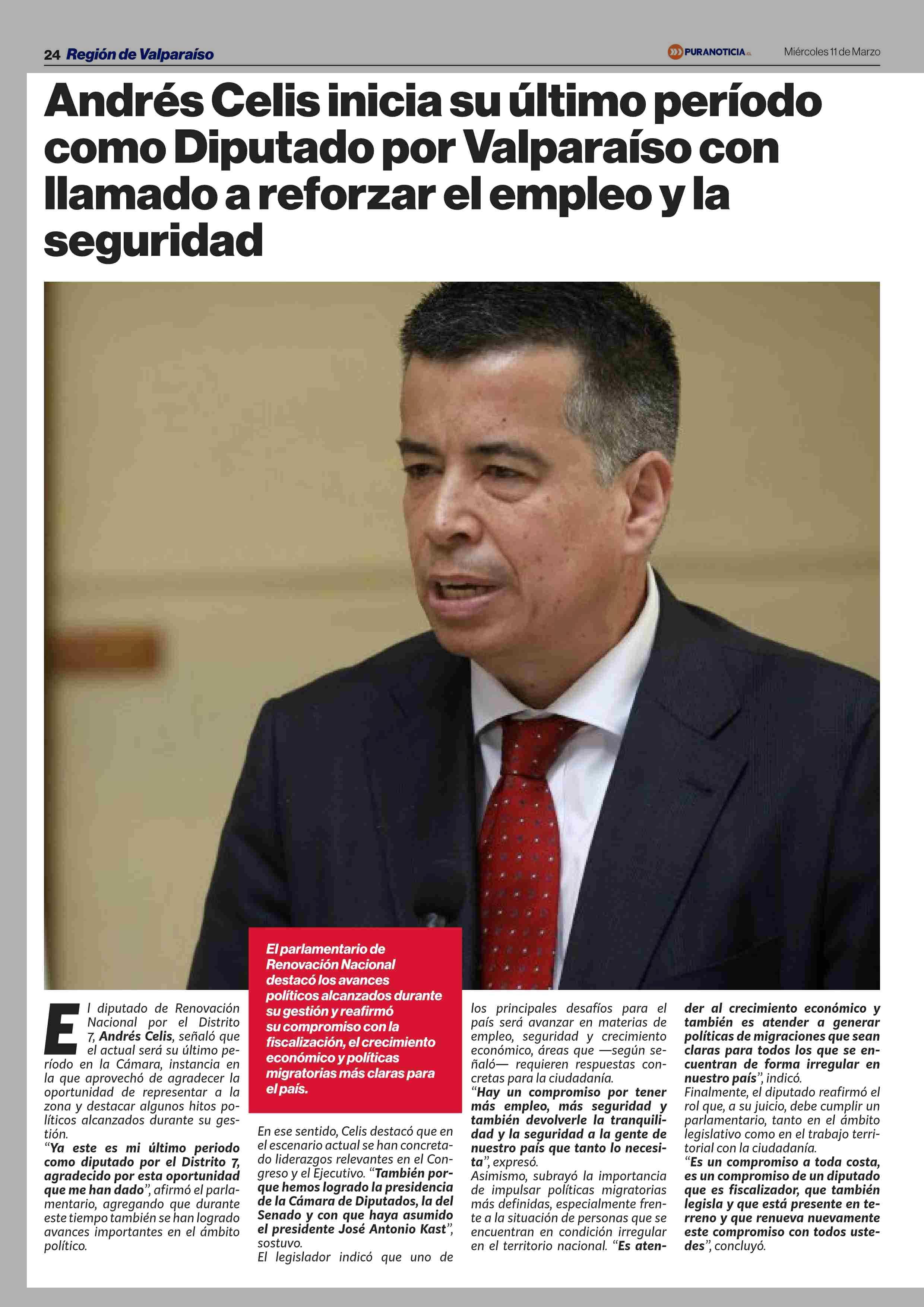 Andrés Celis inicia su último período como Diputado por Valparaíso con llamado a reforzar el empleo y la seguridad 11-03-2026 Puranoticia.cl |