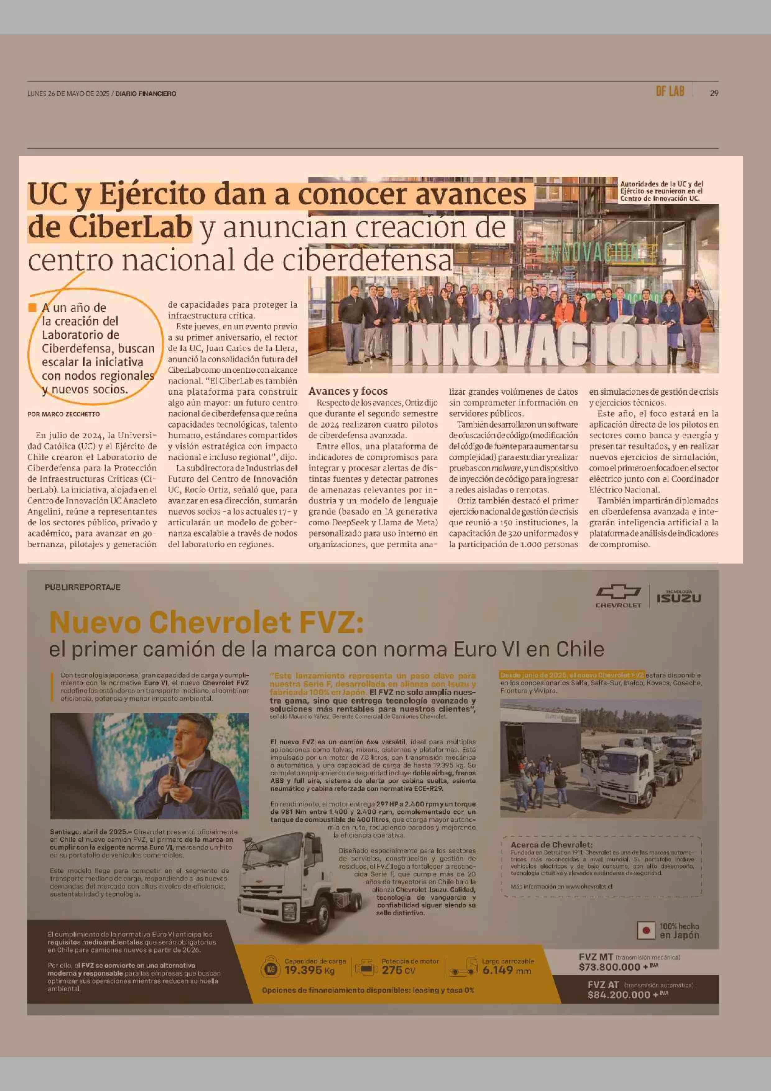 UC y Ejército dan a conocer avances de CiberLab y anuncian creación de PP centro nacional de ciberdefensa 26-05-2025 Diario Financiero |