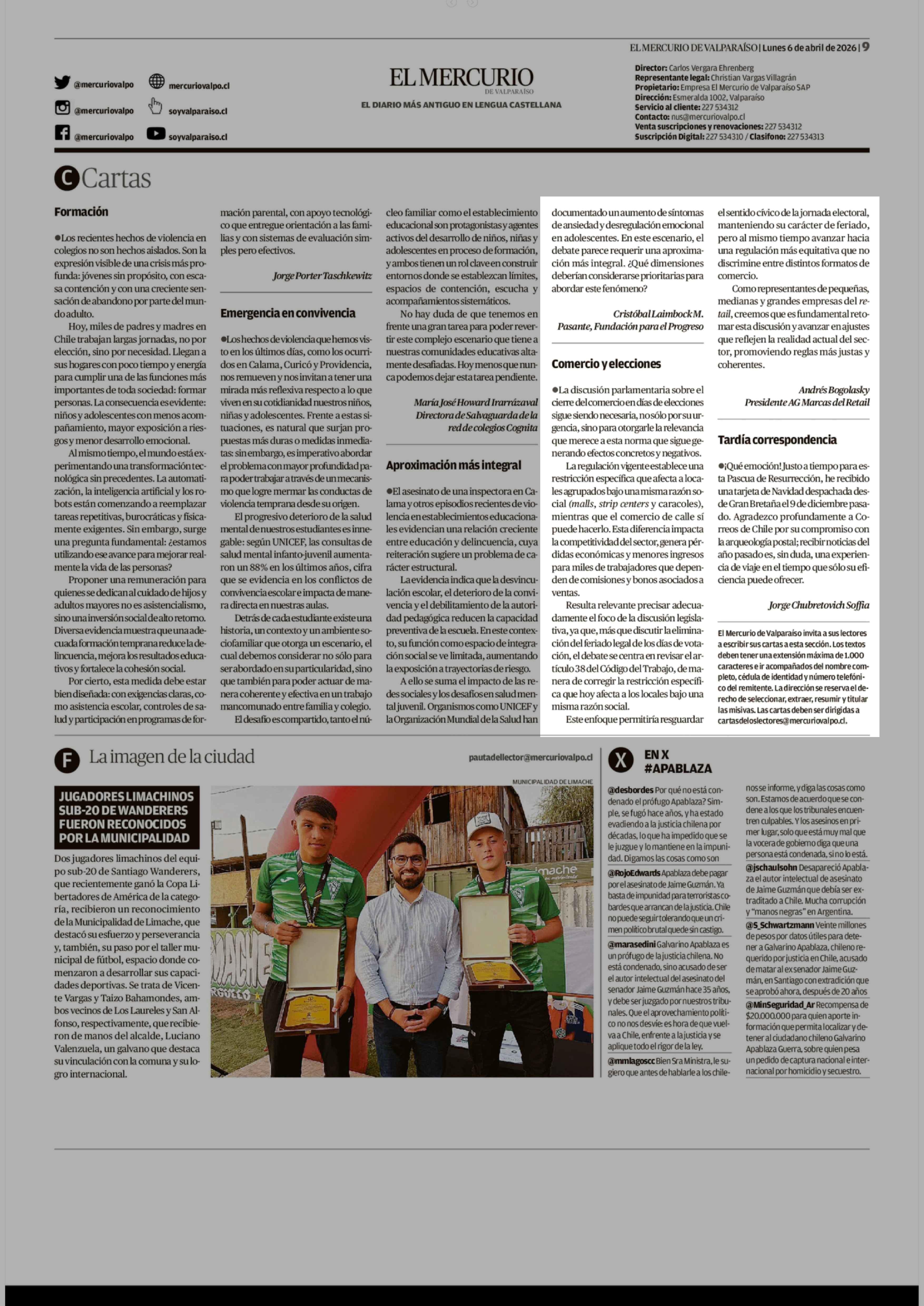 Cartas: Comercio y elecciones 06-04-2026 El Mercurio de Valparaíso |