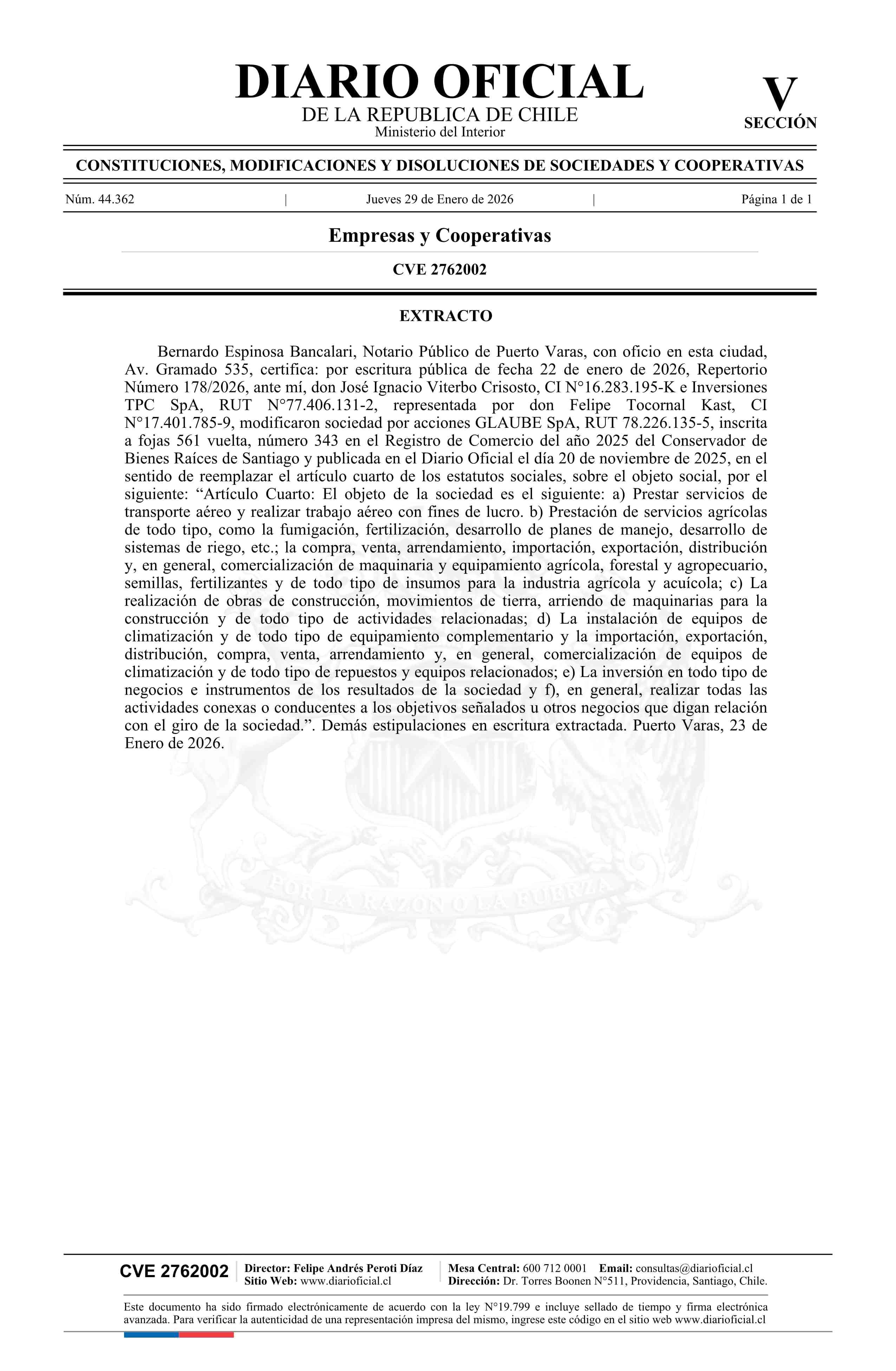 Título: GLAUBE SpA 78.226.135-5*