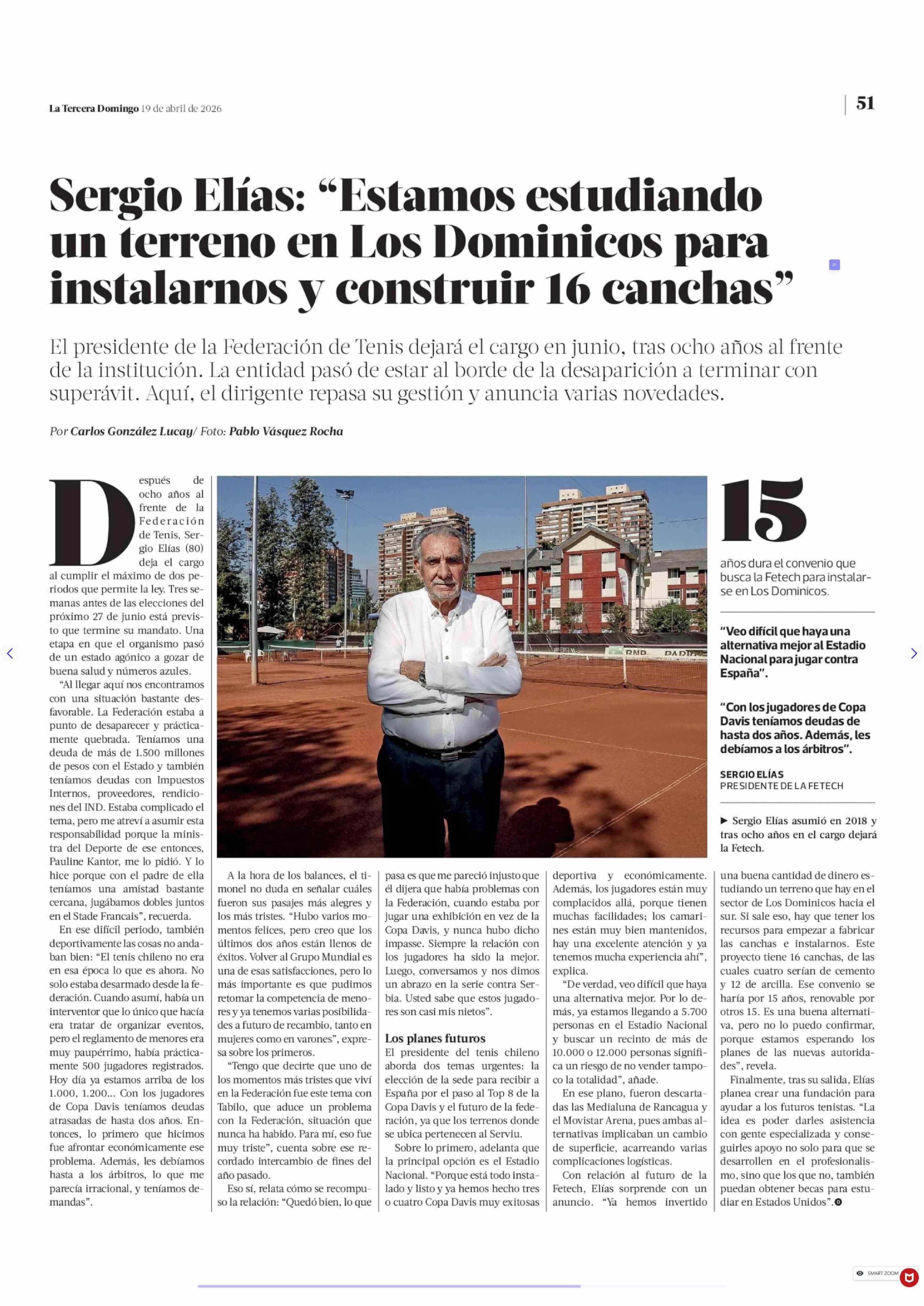 Sergio Elías: "Estamos estudiando un terreno en Los Dominicos para instalarnos y construir 16 canchas" 19-04-2026 La Tercera |