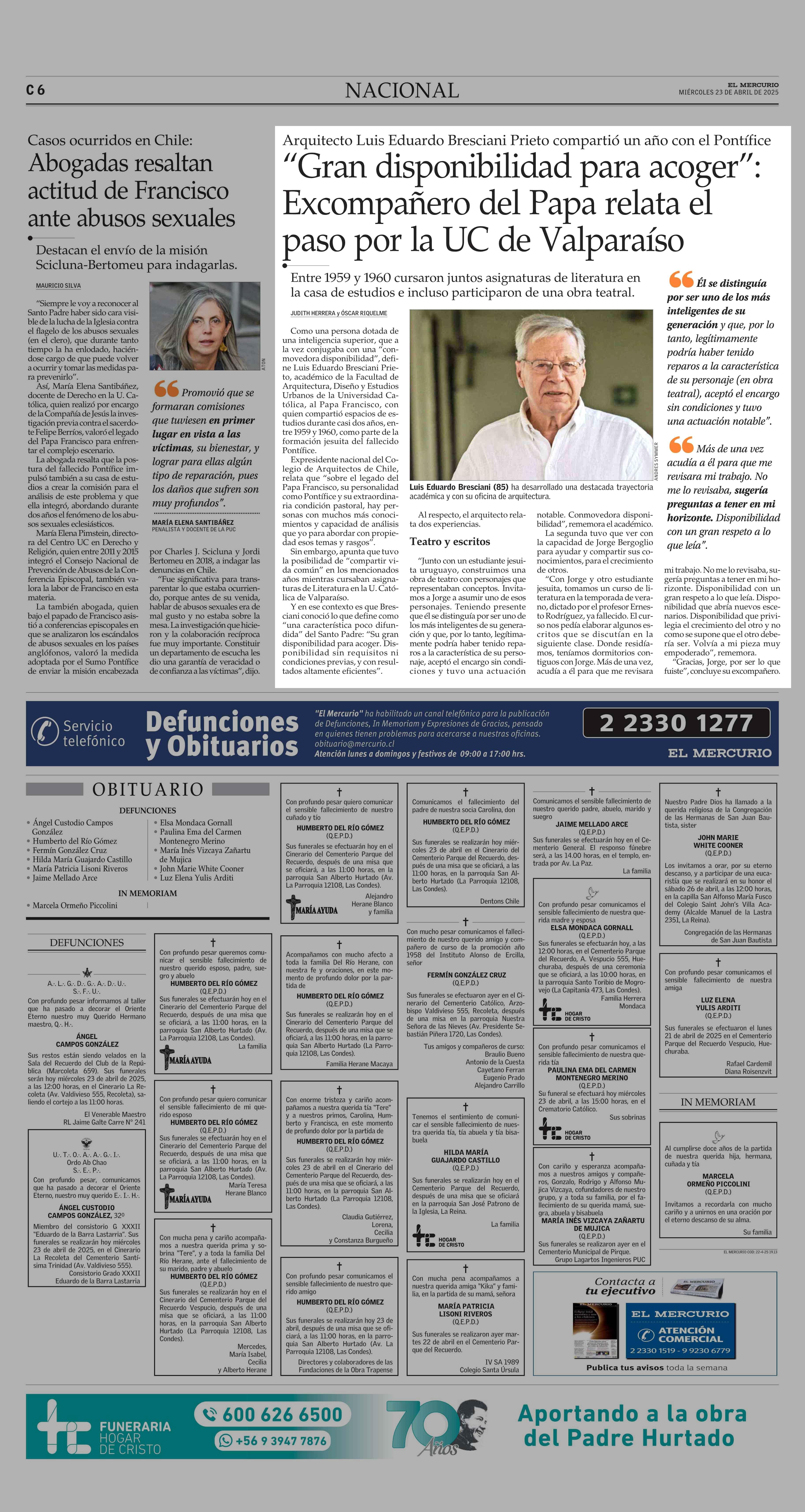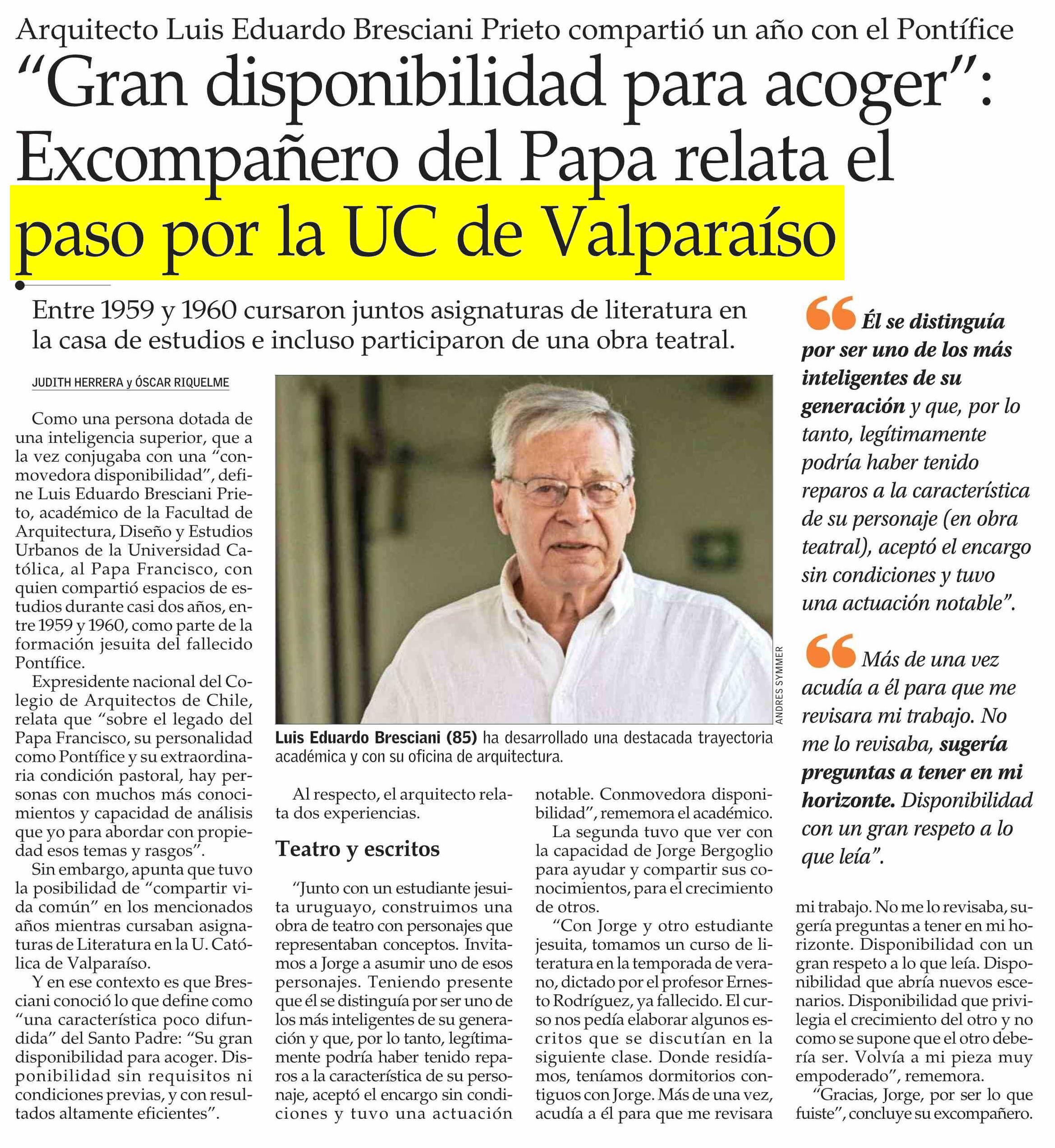 “Gran disponibilidad para acoger”: Excompañero del Papa relata el paso por la UC de Valparaíso 23-04-2025 El Mercurio |