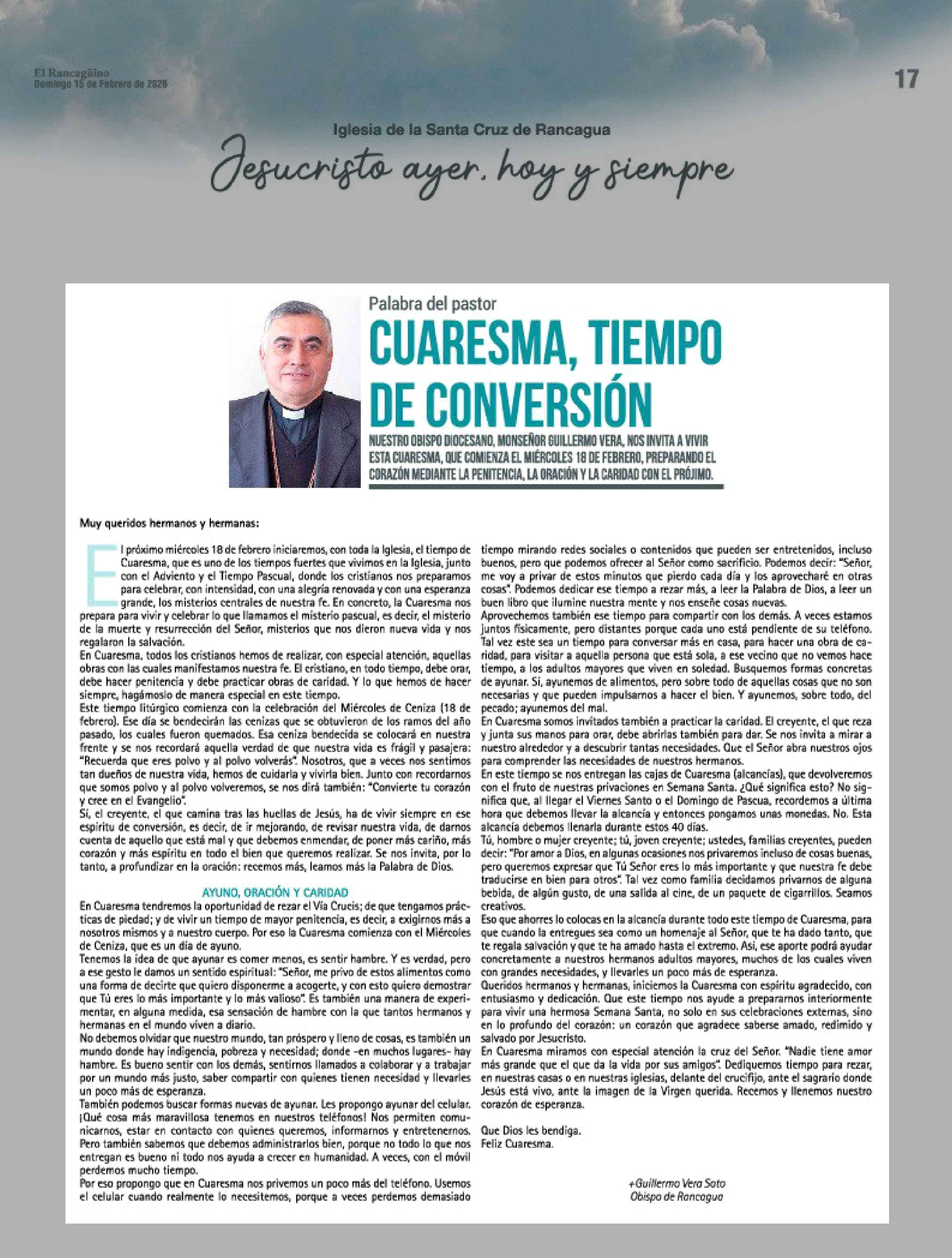 | Título: | Columnas de Opinión: Cuaresma, que es uno de los tiempos fuertes que vivimos en la Iglesia, junto buenos, pero que podemos ofrecer al Señor como sacrificio. Podemos decir: "Señor, con el Adviento y el Tiempo Pascual, donde los cristianos nos preparamos para celebrar, con intensidad, con una alegria |