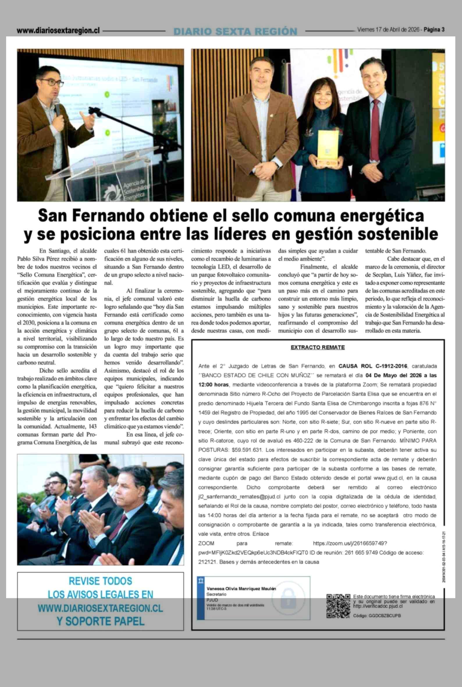 San Fernando obtiene el sello comuna energética y se posiciona entre las líderes en gestión sostenible 17-04-2026 Diario VI Región |