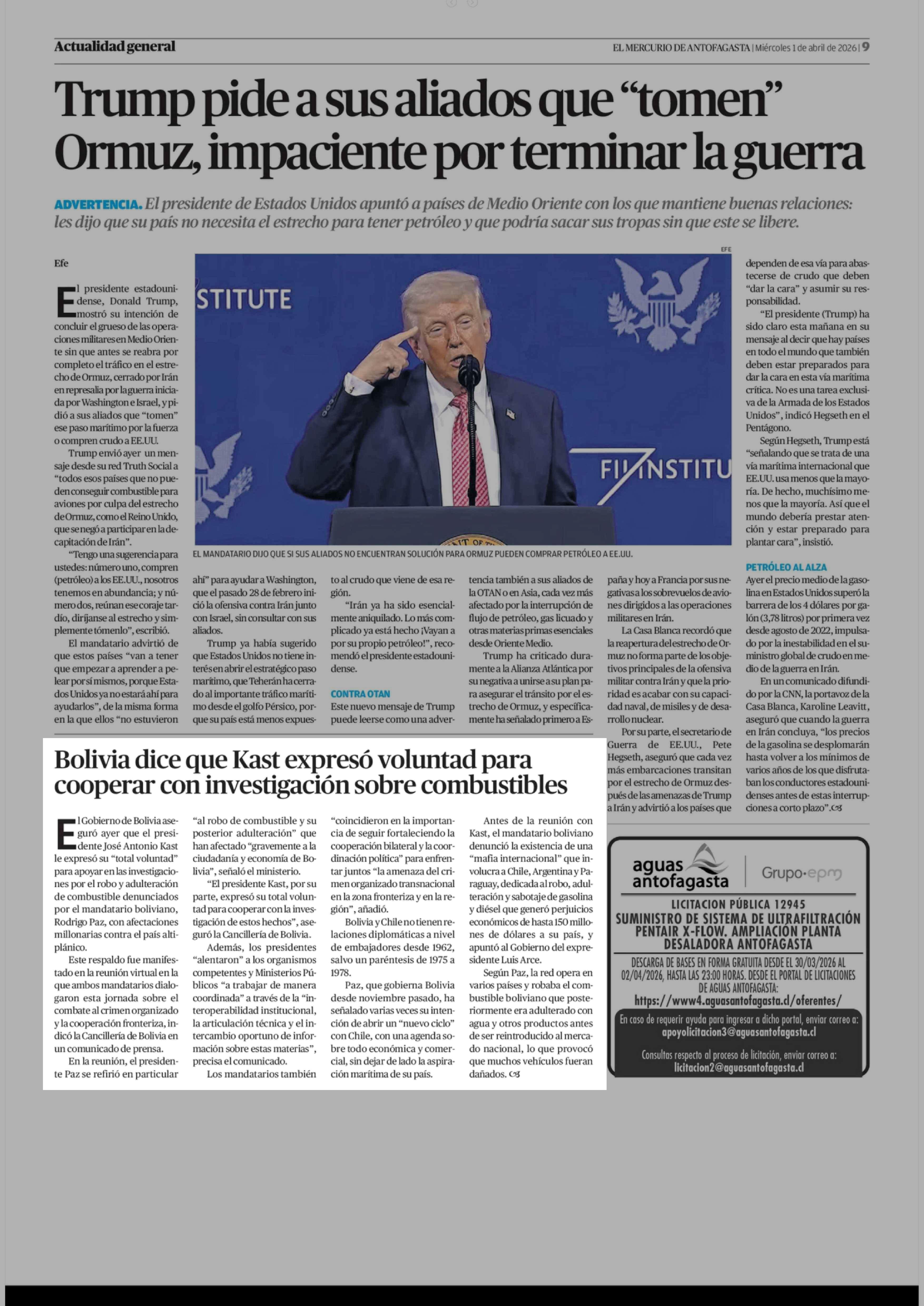 Bolivia dice que Kast expresó voluntad para cooperar con investigación sobre combustibles 01-04-2026 El Mercurio de Antofagasta |