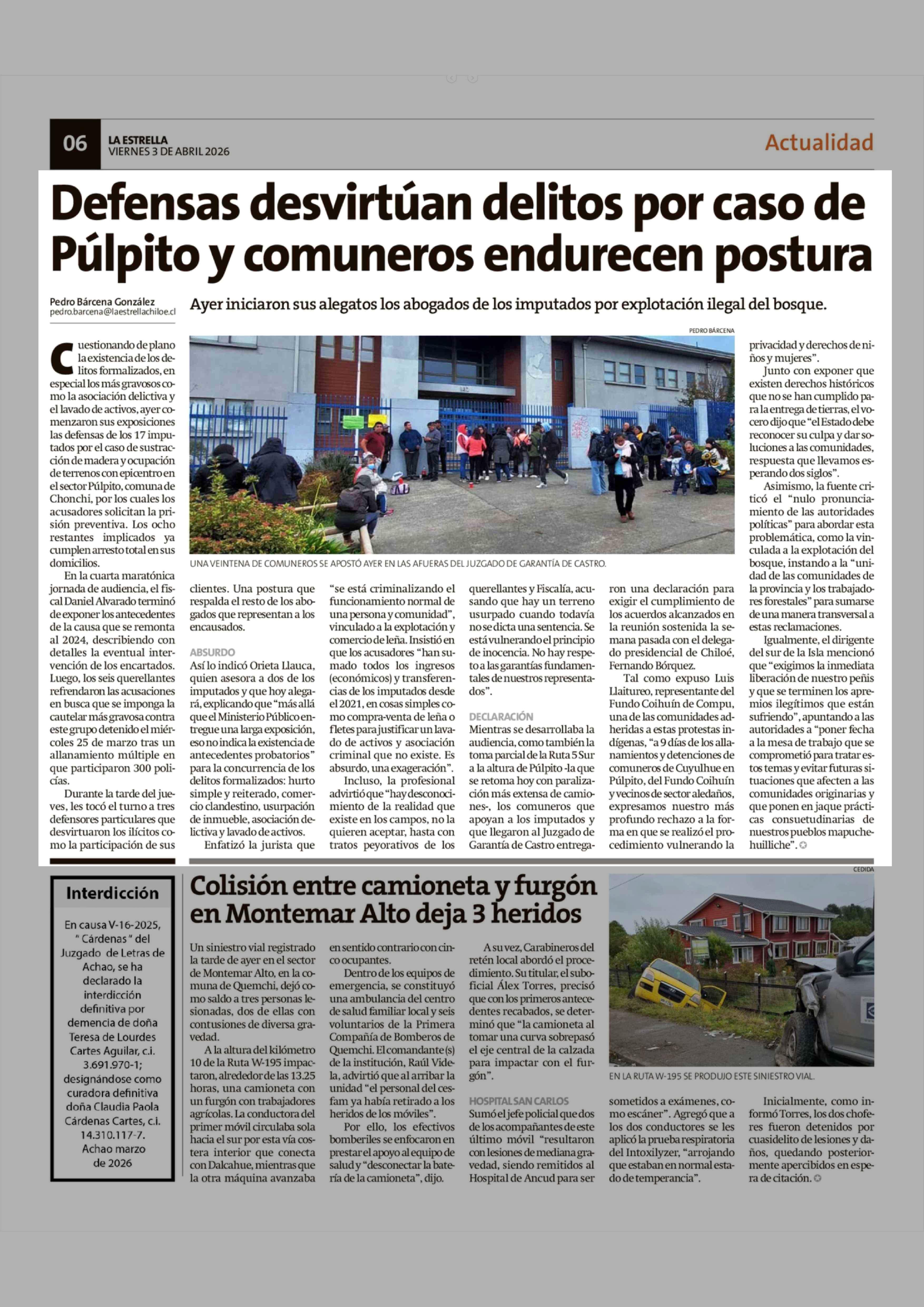 Defensas desvirtúan delitos por caso de Pulpito y comuneros endurecen postura 03-04-2026 La Estrella de Chiloé |