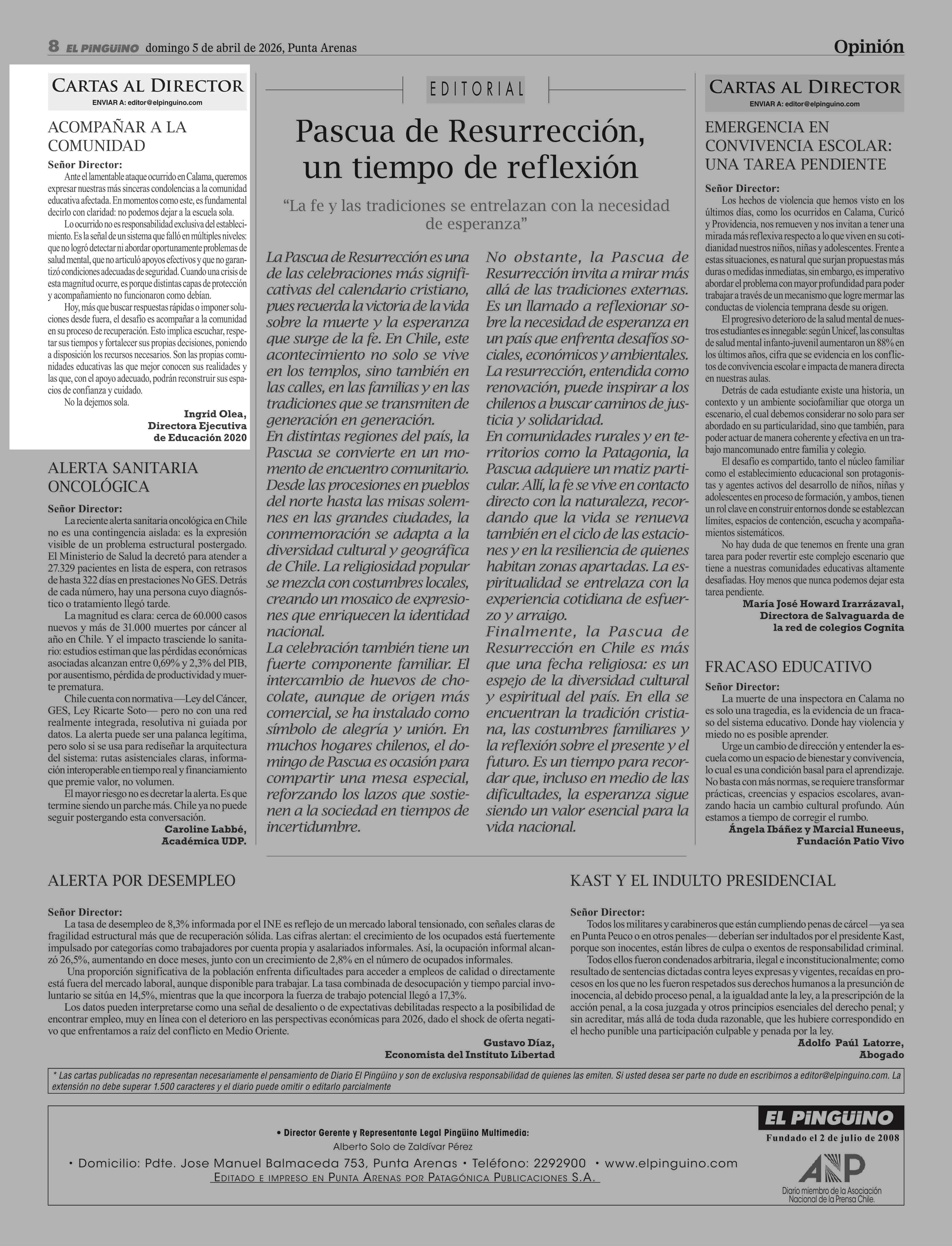 CARTAS: ACOMPAÑAR A LA COMUNIDAD 05-04-2026 El Pingüino |