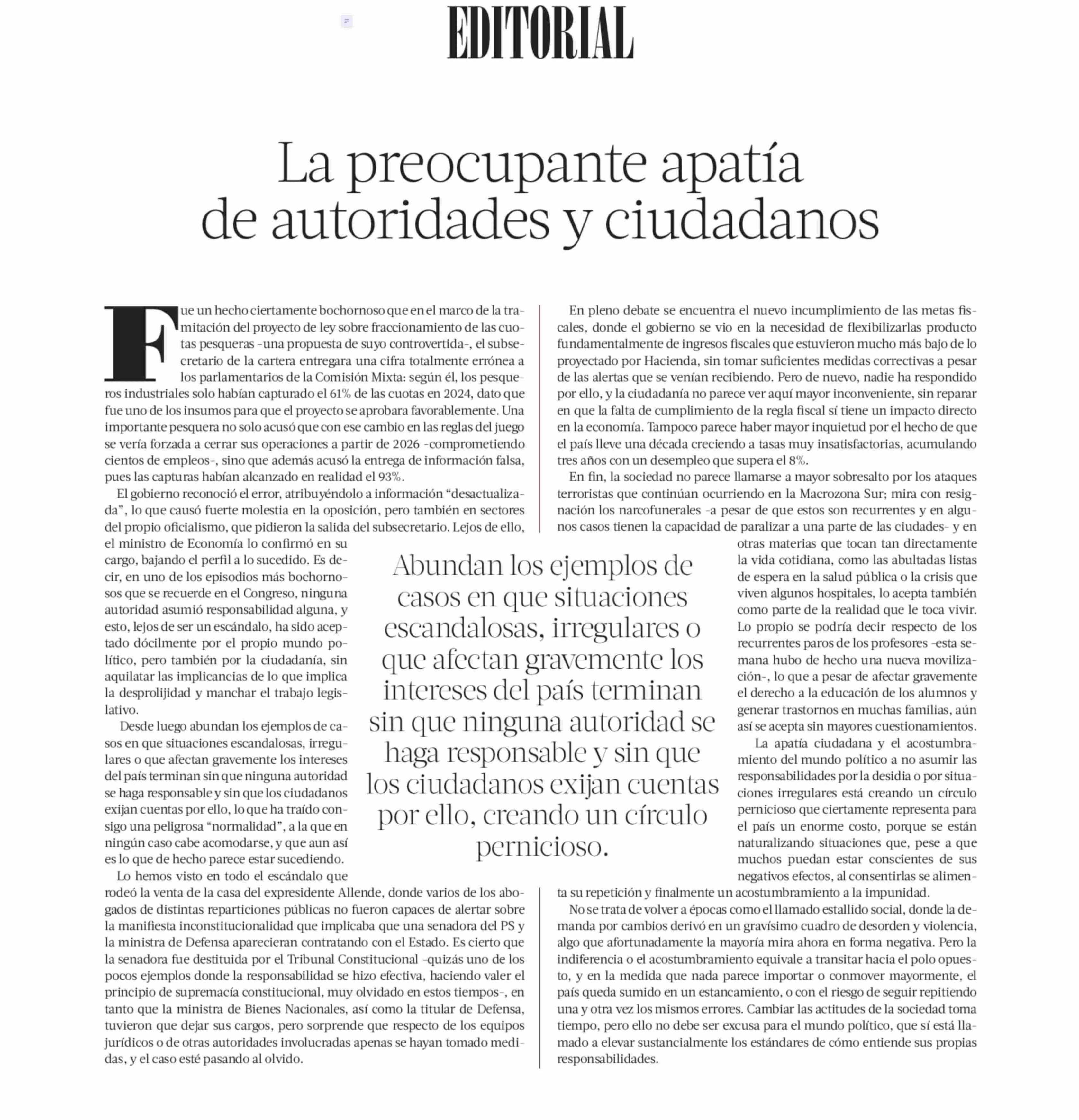 EDITORIAL: La preocupante apatía de autoridades y ciudadanos 18-05-2025 La Tercera |