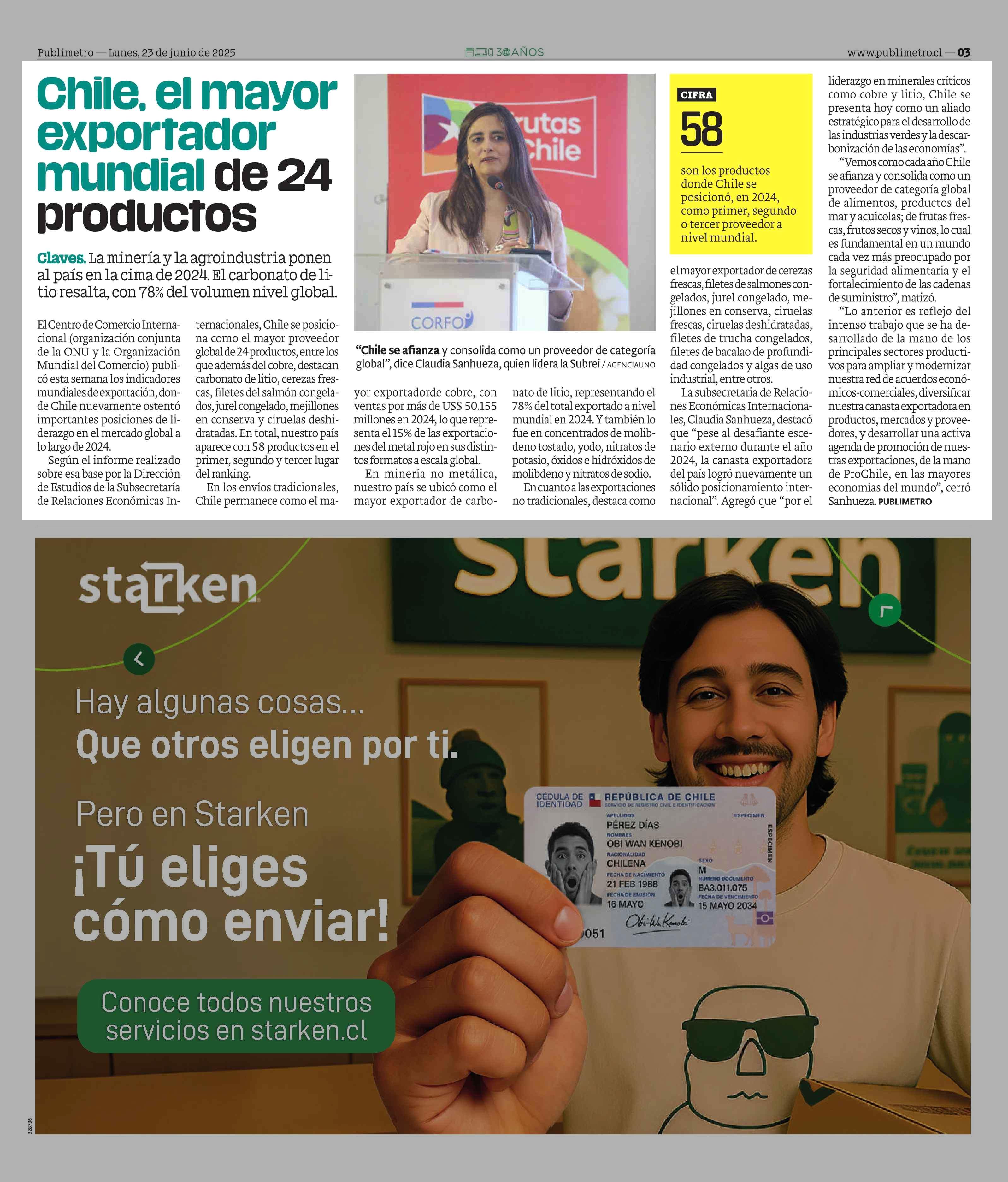 Chile, el mayor mundial de 24 productos exportador 23-06-2025 Publimetro |