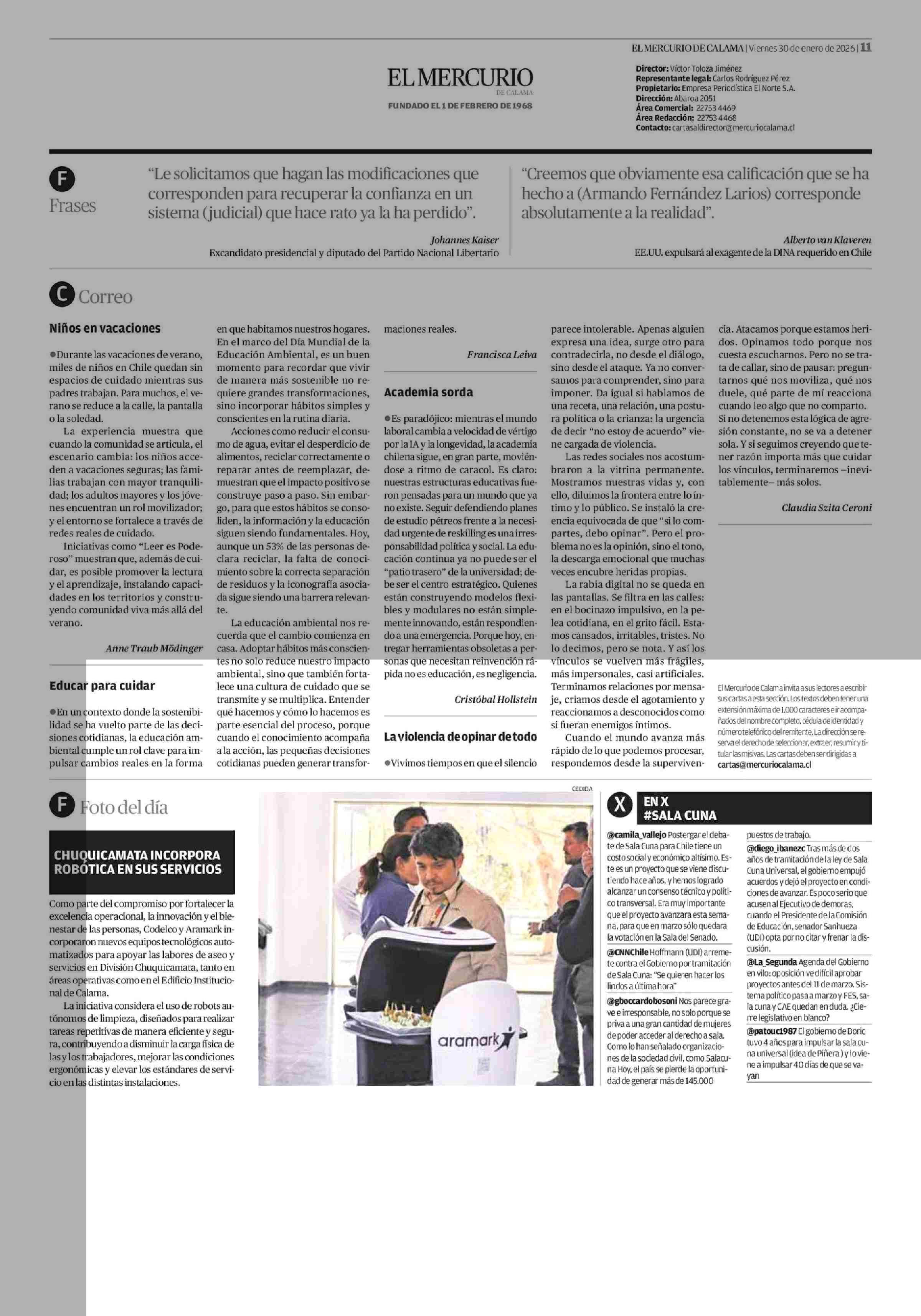 Cartas: Educar para cuidar 30-01-2026 El Mercurio de Calama |