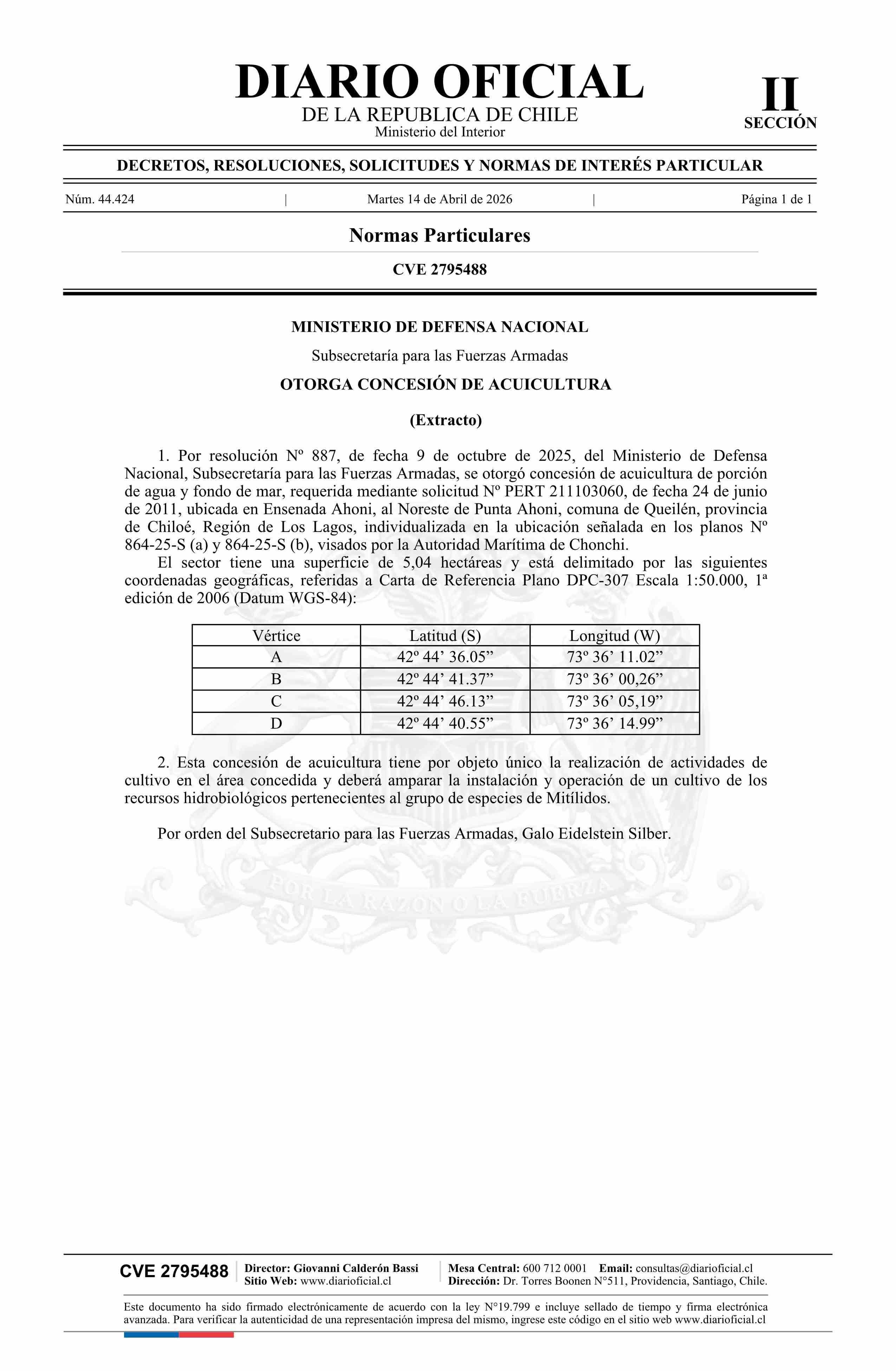 Título: Extracto de resolución número 887, de 2025.- Otorga concesión de acuicultura