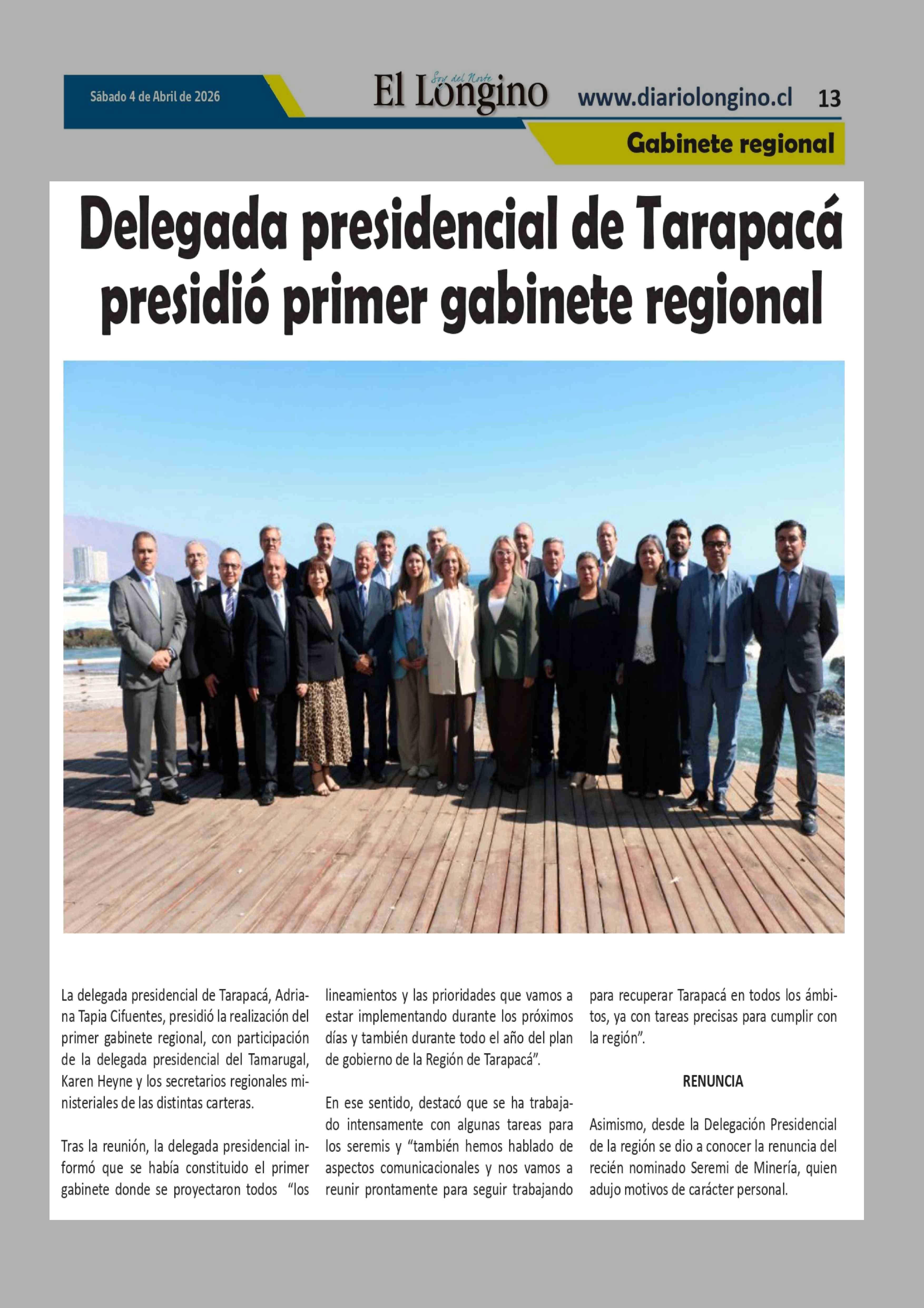Delegada presidencial de Tarapacá presidió primer gabinete regional 04-04-2026 El Longino |