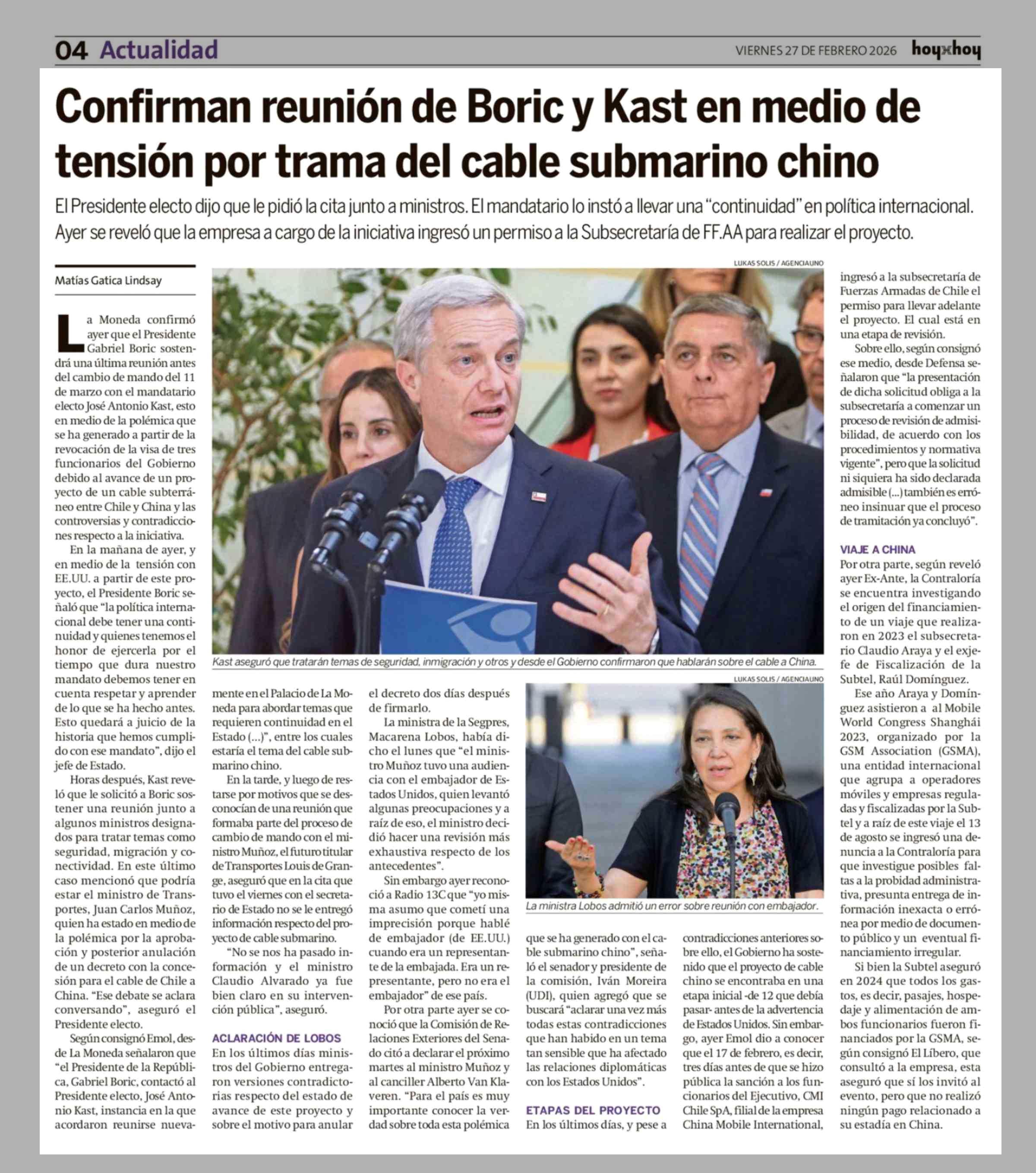 | Título: | Confirman reunión de Boric y Kast en medio de tensión por trama del cable submarino chino |