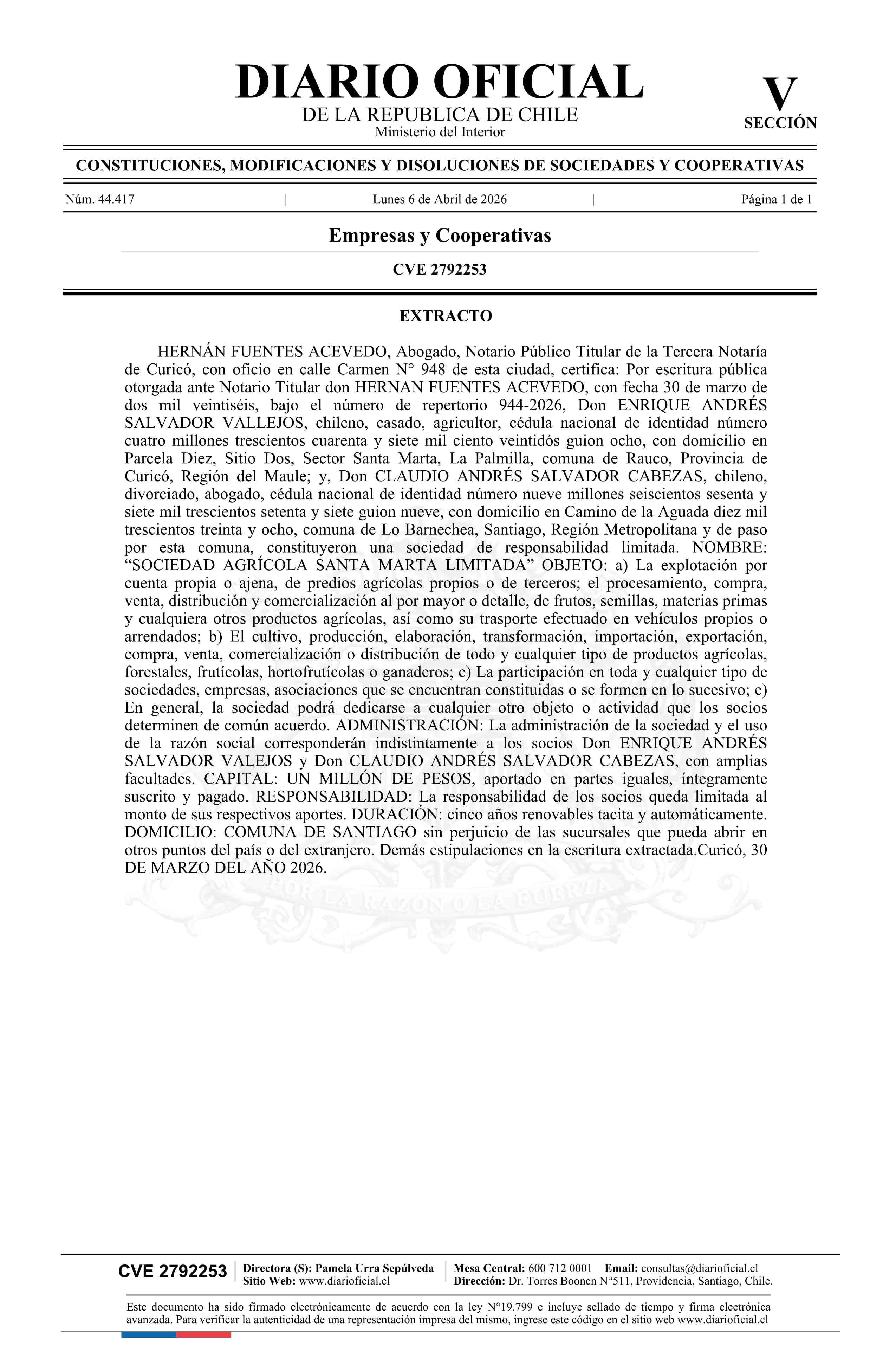 Título: SOCIEDAD AGRÍCOLA SANTA MARTA LIMITADA