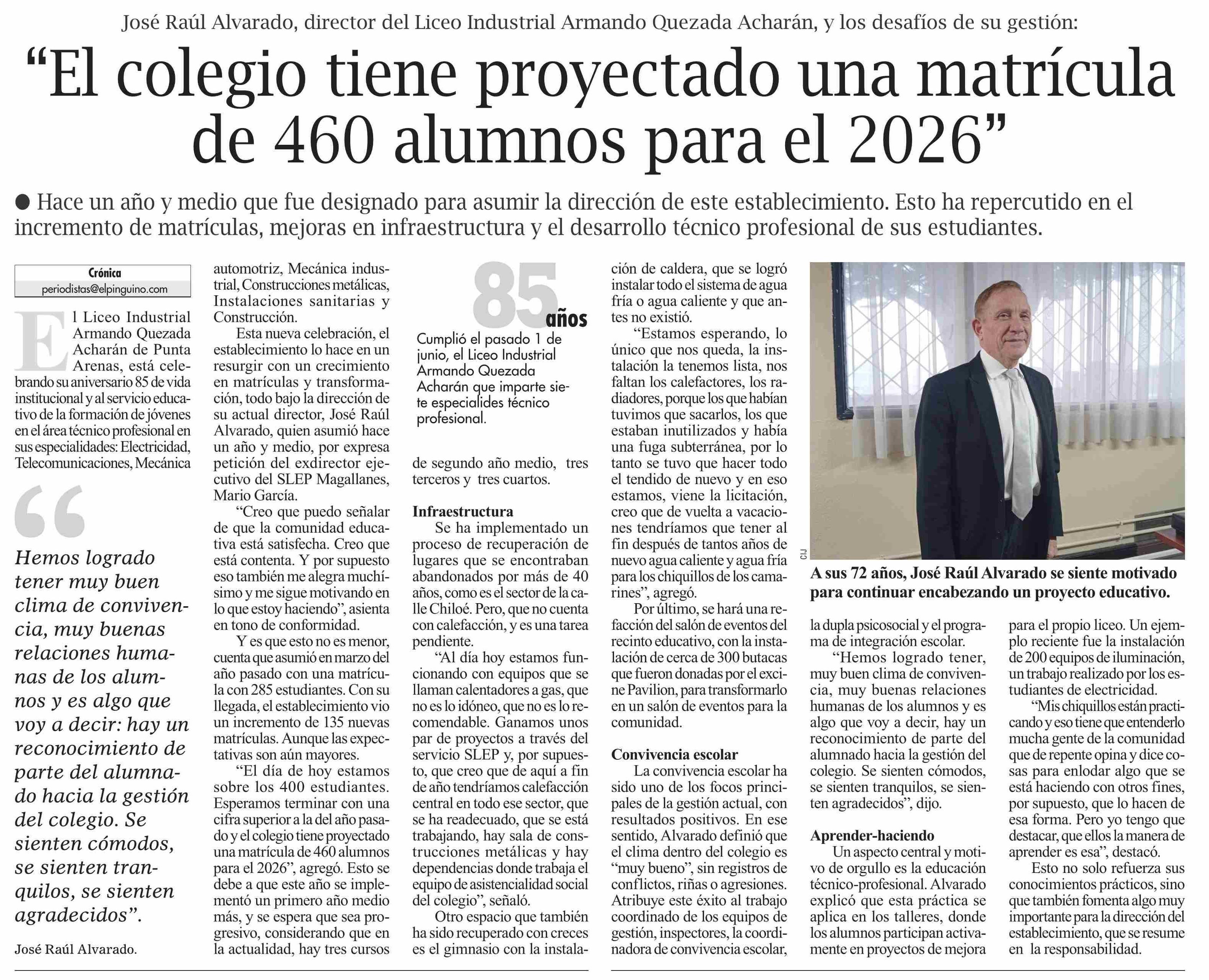 “El colegio tiene proyectado una matrícula de 460 alumnos para el 2026” 03-06-2025 El Pingüino |