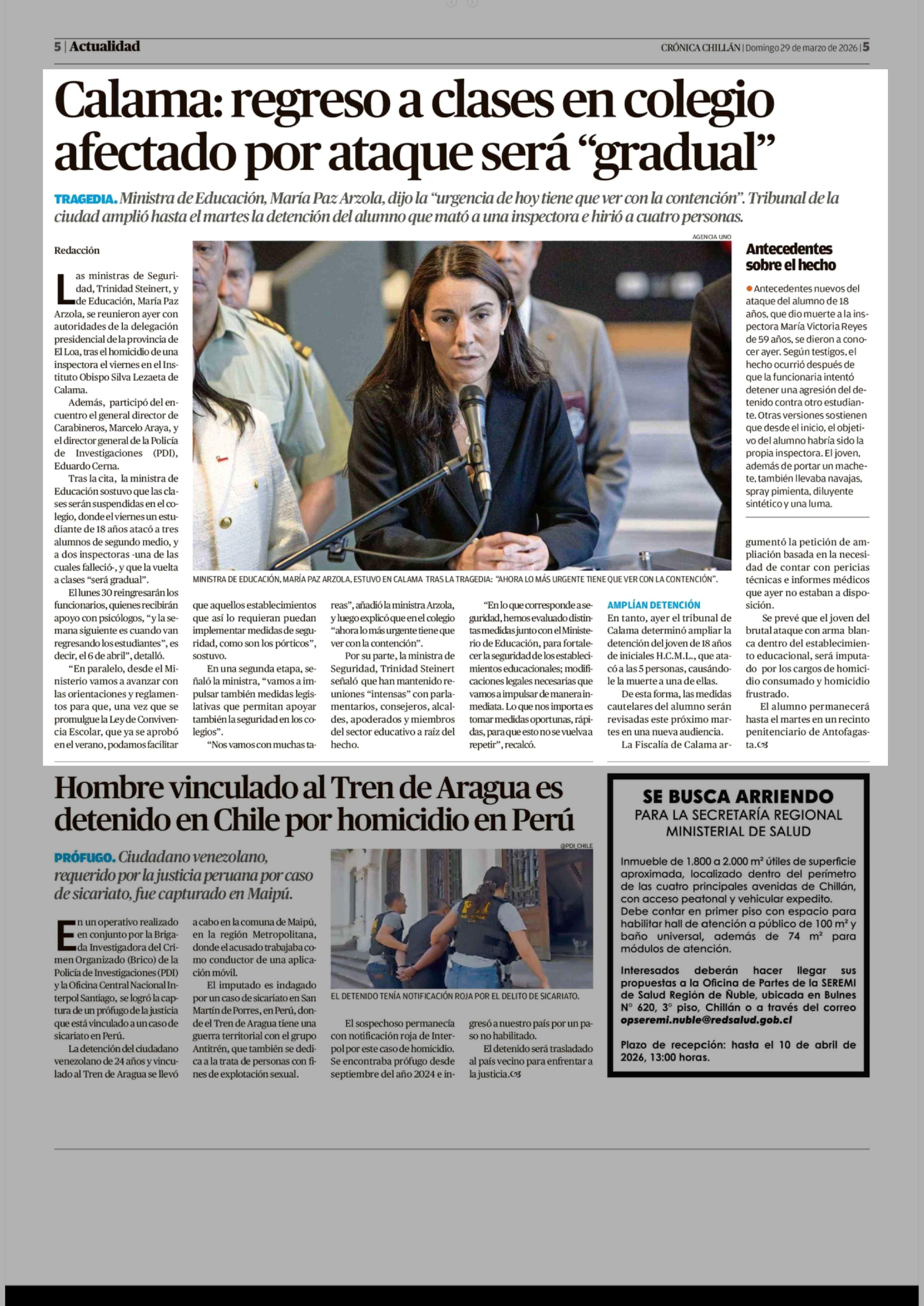 Calama: regreso a clases en colegio afectado por ataque será "gradual" 29-03-2026 Crónica de Chillán |