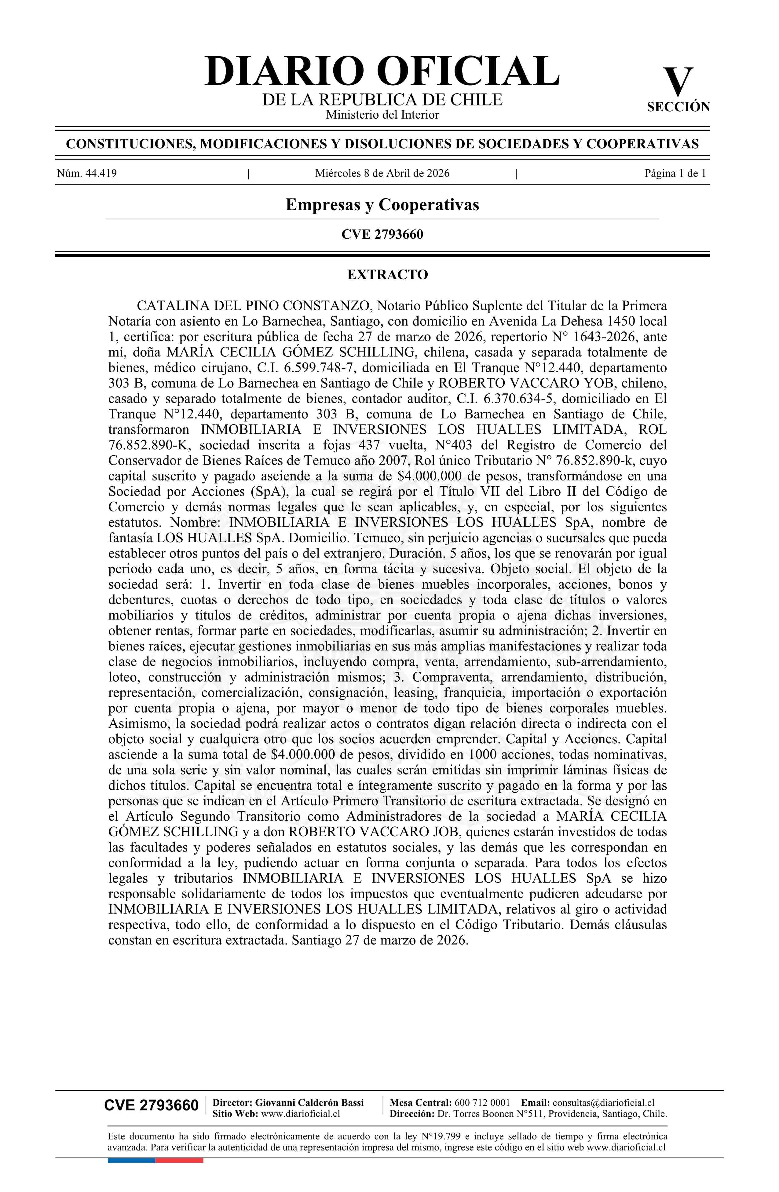 Título: INMOBILIARIA E INVERSIONES LOS HUALLES LIMITADA 76.852.890-K