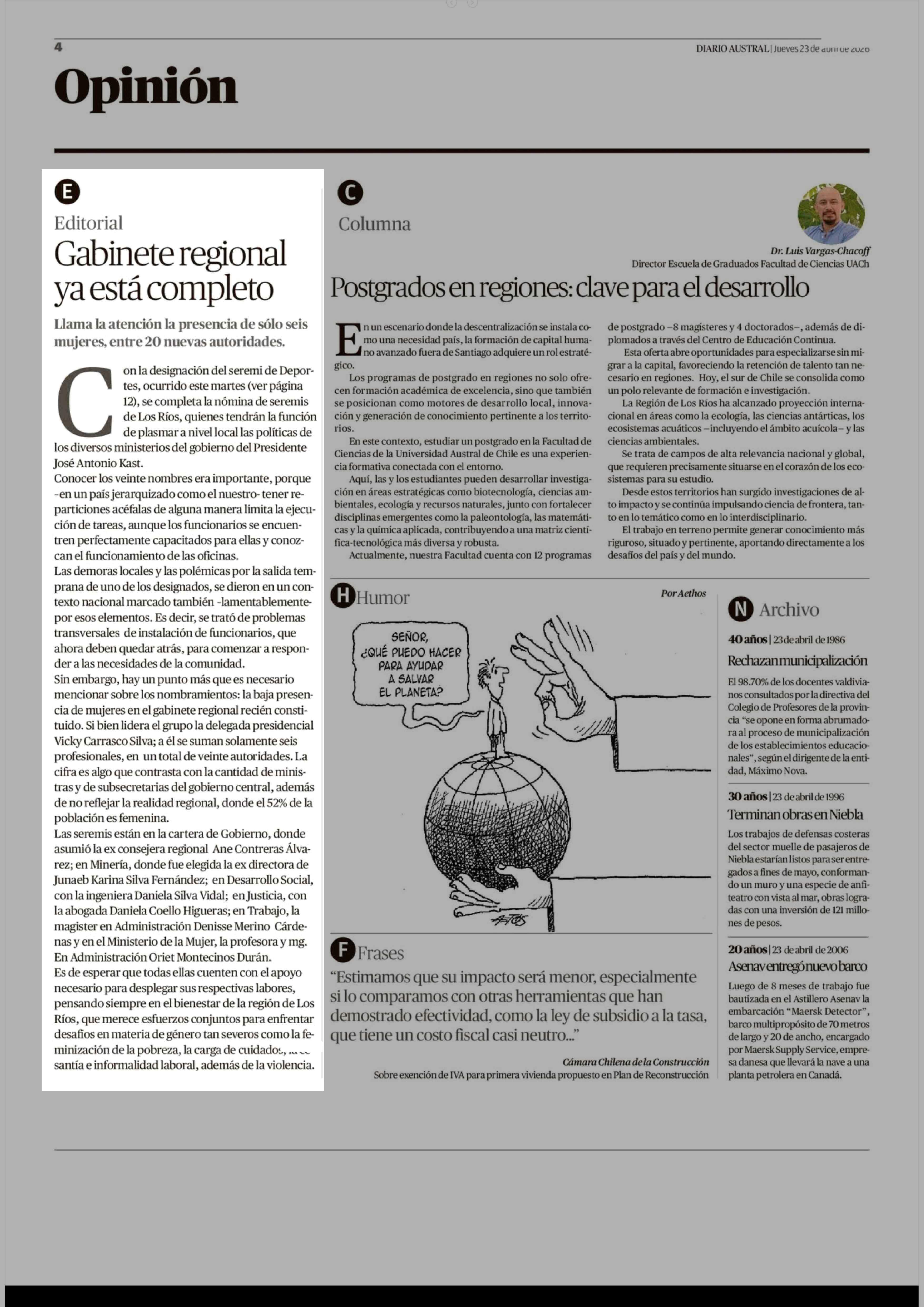 Editorial: Gabinete regional ya está completo 23-04-2026 Diario Austral Región de Los Ríos |